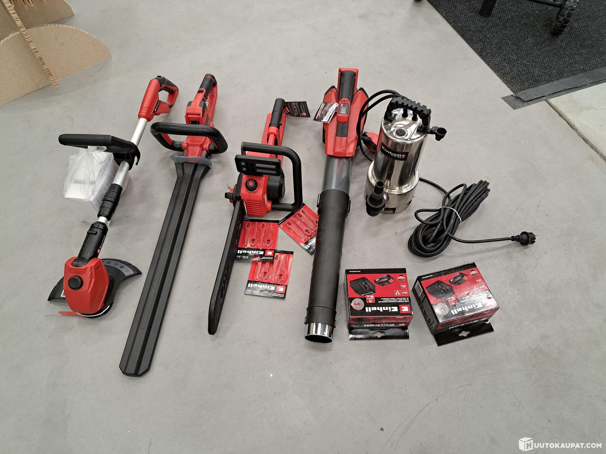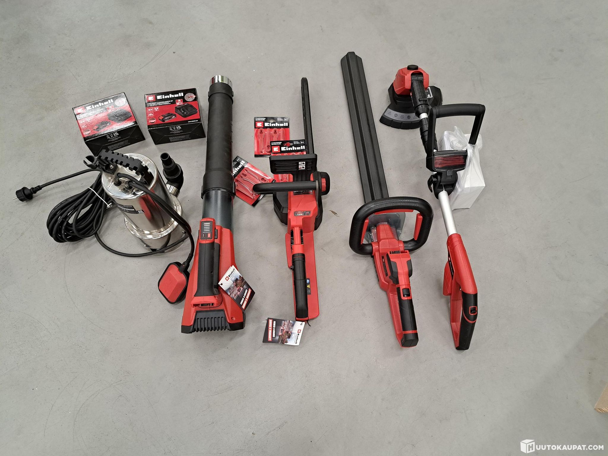 Includes: cordless saw, cordless hedge trimmer, cordless blower, cordless trimmer and an electrically driven submersible pump.