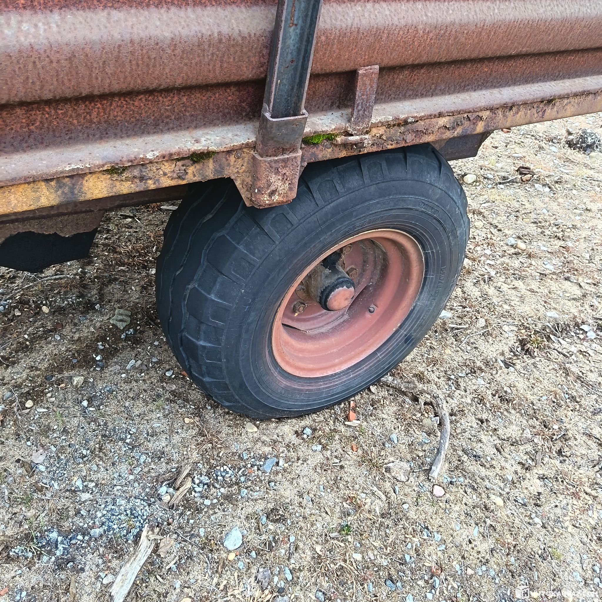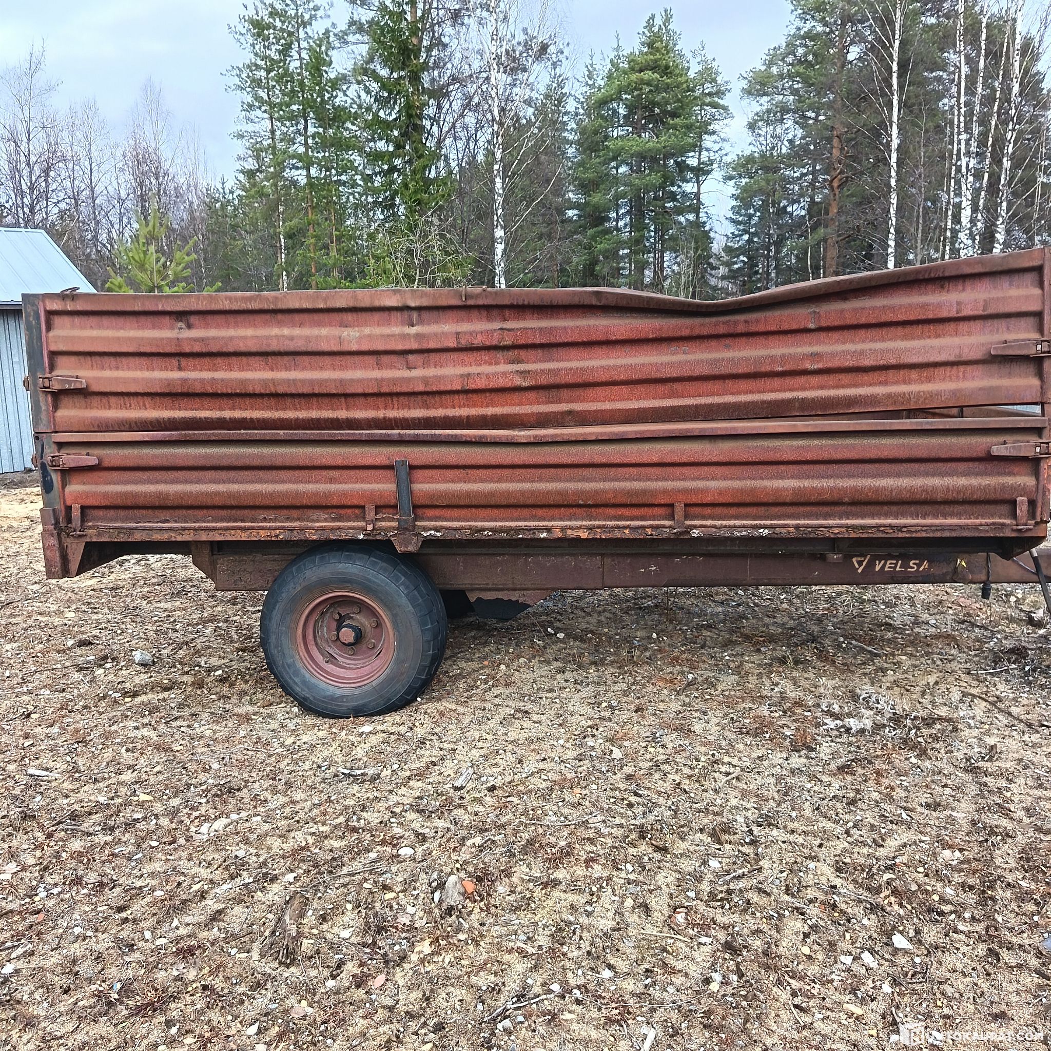 This is a tipping trailer project. Needs work at least on the lights, the hydraulic hose and the edges of the bed. Has stood outdoors for 10 years. For repair.