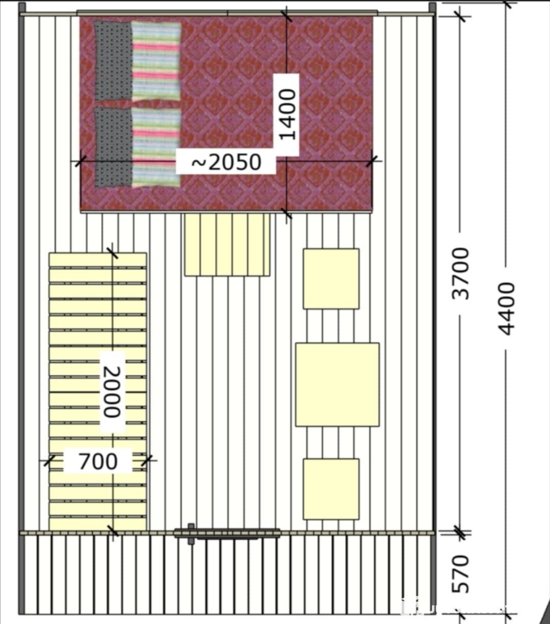 Open the door to find compact interior space for sleeping, spending a summer day or sheltering from rain. A 140 cm plank bed placed in front of the windows also works as a seating area when furnished with cushions and throws. Delivery includes a 2.00 m bed platform, a table and two chairs, making the space versatile even without further furnishing. You must supply the mattress yourself, as sleeper preferences vary. The plank bed length is 205 cm, so a standard-length mattress fits comfortably.