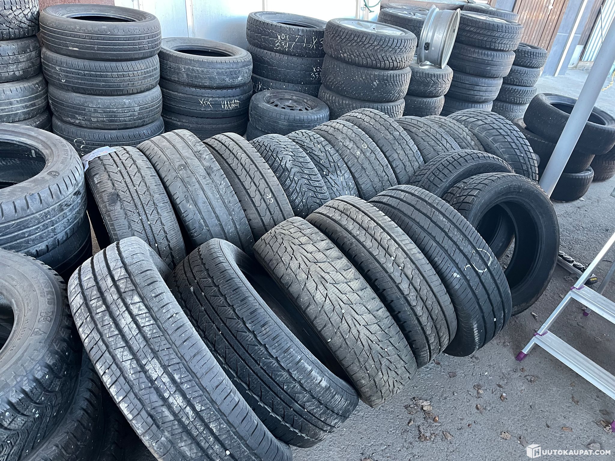 Approx. 75 tyres, plus 6 sets of tyres with rims and around 20 rims. Some aluminium rims. All are usable and should be relatively new. Everything as shown in the pictures. Wheel sets pictured separately are included in the sale. Sold to the highest bidder!
