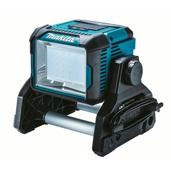 The Makita DML811 is a powerful jobsite light with 30 LED emitters. The lamp head tilts 240° vertically. The unit runs from mains power or a single LXT battery. The mains lead is detachable and has a storage location on the side of the light’s stand. • Battery protection system automatically cuts power when the battery is low. • IP65 dust- and water-resistance (DC operation only). • Controller with memory recalls the last used brightness setting. • Detachable mains lead can be stored in the stand between uses. The DML811 offers three light levels: 3000 / 1500 / 750 lm, allowing adjustment to suit the task. The light recalls the previous power setting so you don’t have to reset brightness each time. Run time with an 18 V 6.0 Ah LXT battery is approximately 3–13 h, depending on the power setting. An optional stand (GM00002073) is available separately. The stand is height-adjustable from 1300–2000 mm and can hold two lights at once. Please note: this product is the body-only version. Battery and charger are sold separately. Technical specifications: • power source: battery • voltage: 14.4 / 18 / 230 V • battery type: LXT • battery protection system • supplied without battery and charger • luminous flux (light output): 3000 / 1500 / 750 lm • illuminance: 1800 / 800 / 350 lx • LED power: 30 x 1.05 W • run time (18 V, 6.0 Ah): 13 / 7.5 / 3 h • mains lead: 2.5 m • weight with battery (EPTA): 4.1–4.8 kg • dimensions (L x W x H): 249 x 302 x 361 mm