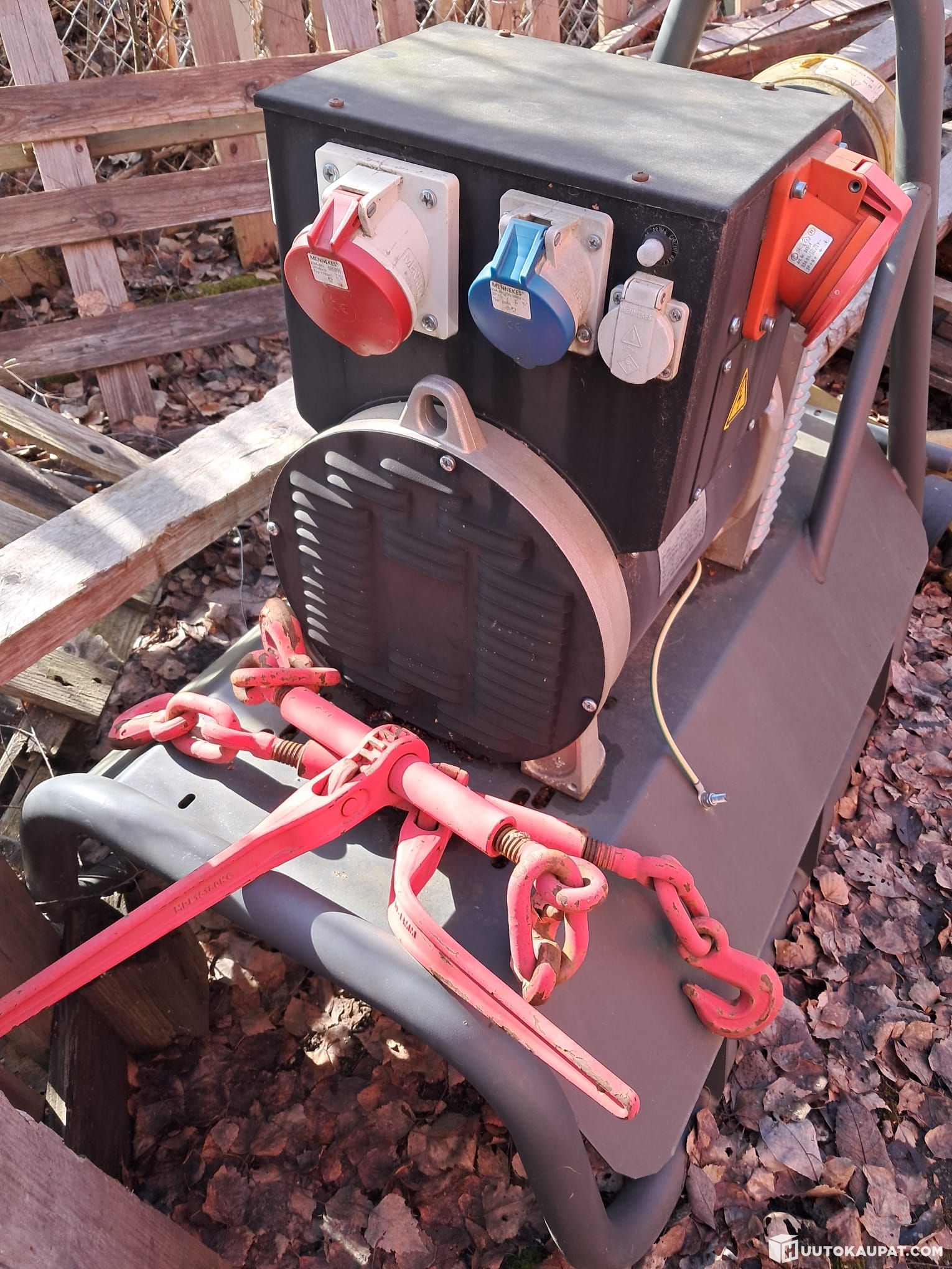 The unit is mounted on a sturdy painted steel frame and fitted with a CEE socket panel for three- and single-phase connections.