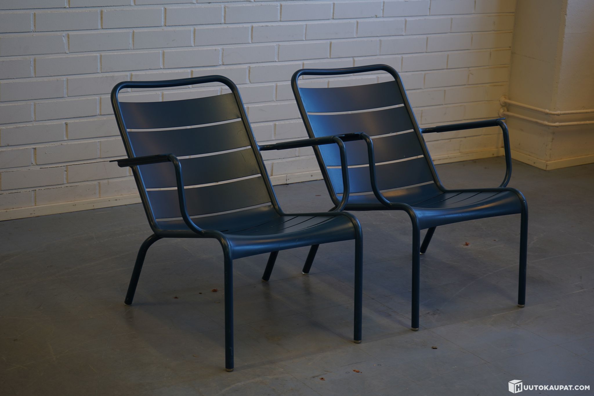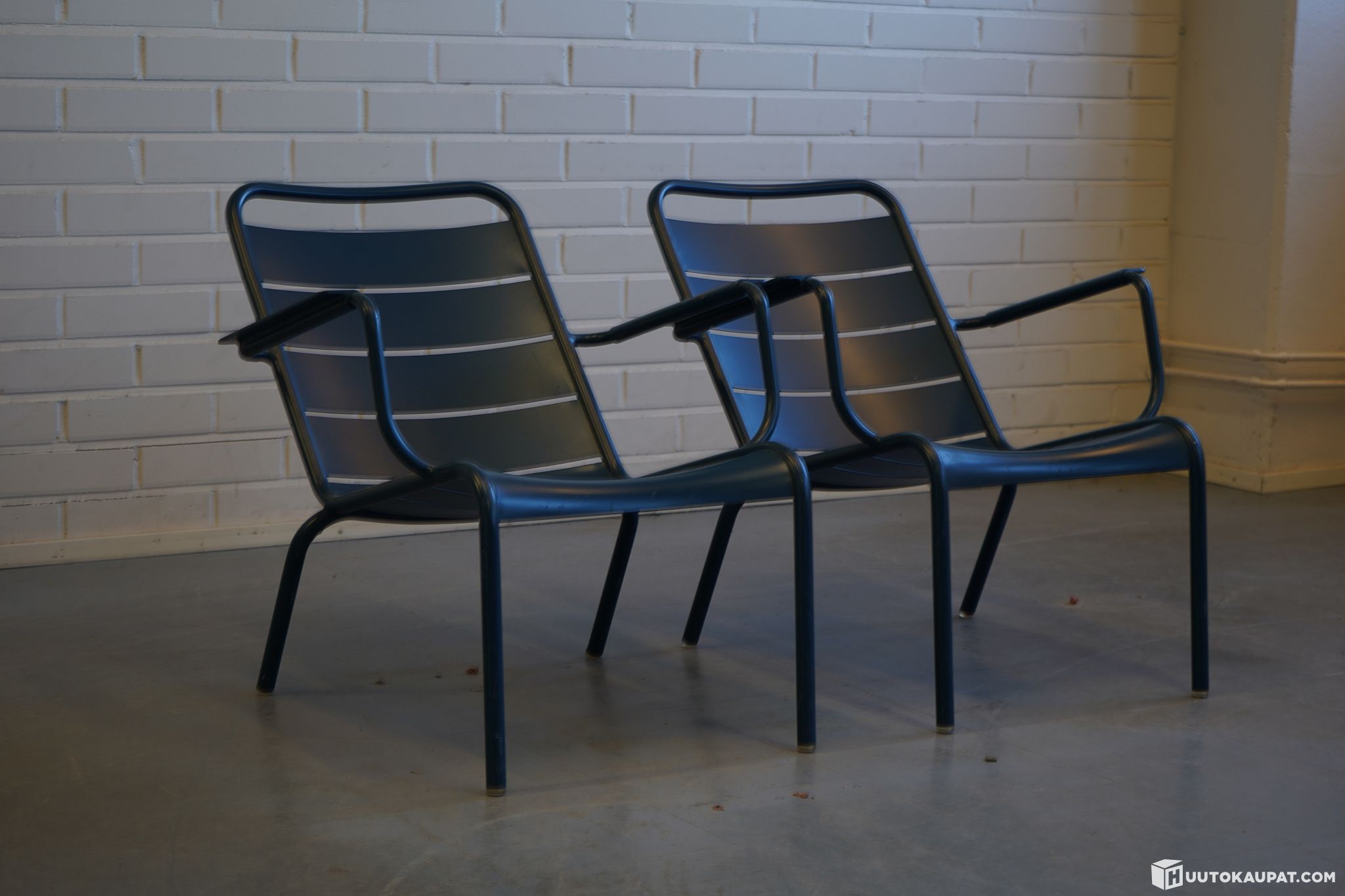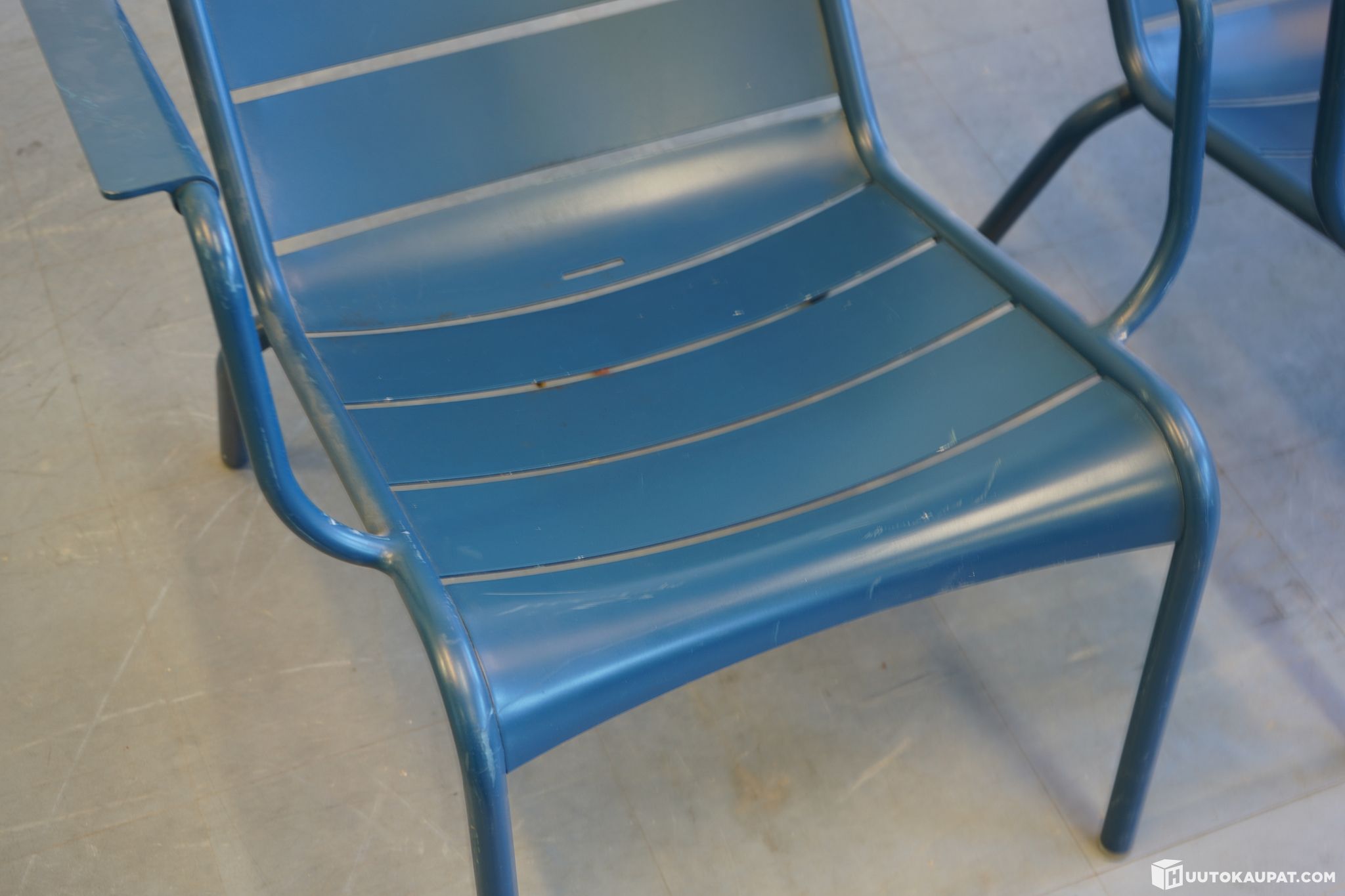 Two Fermob designer chairs. Sturdy frame painted blue. Model Luxembourg, designer Frédéric Sofia.