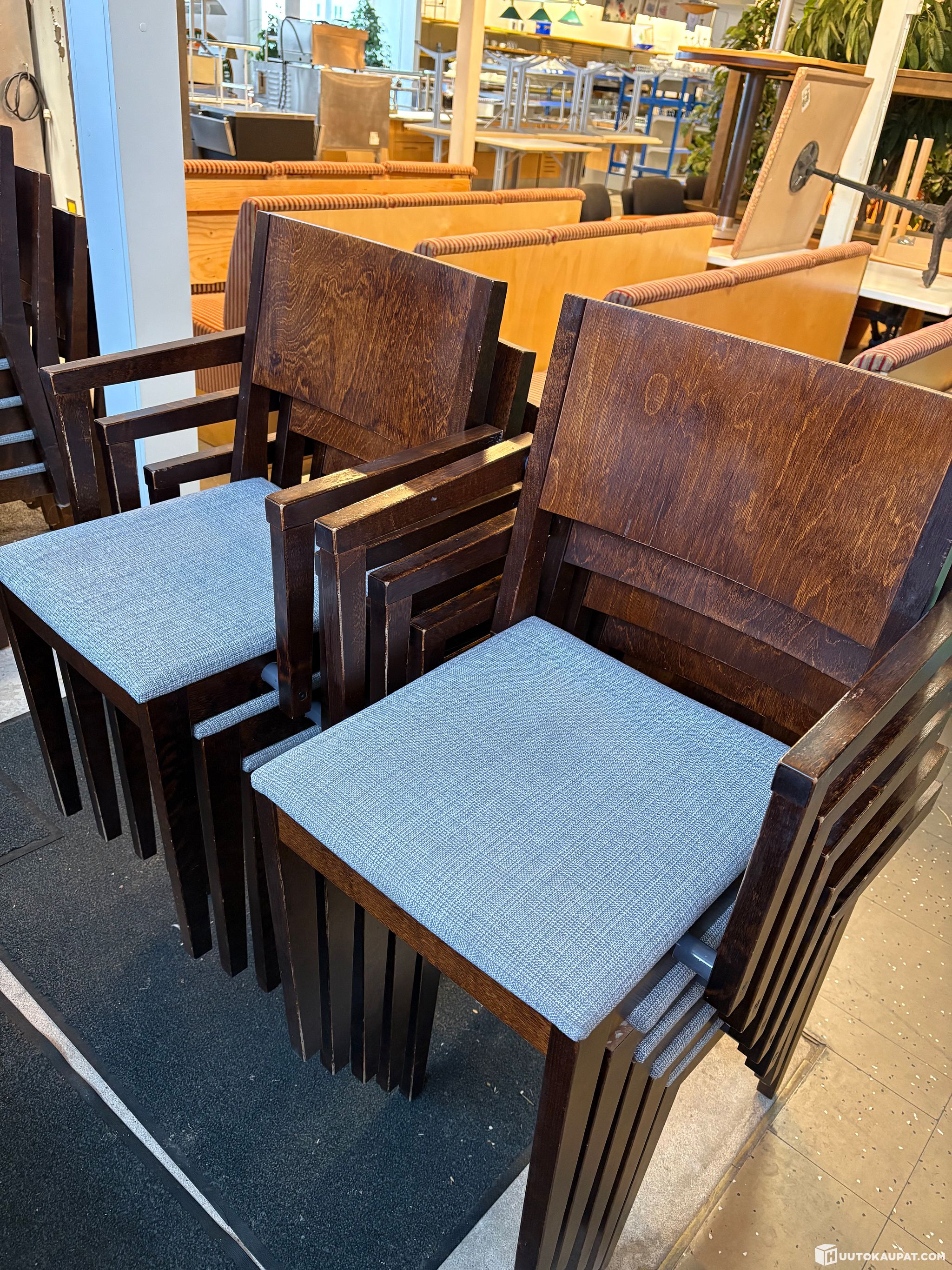 Dark wooden frame / blue-grey fabric on the seat.