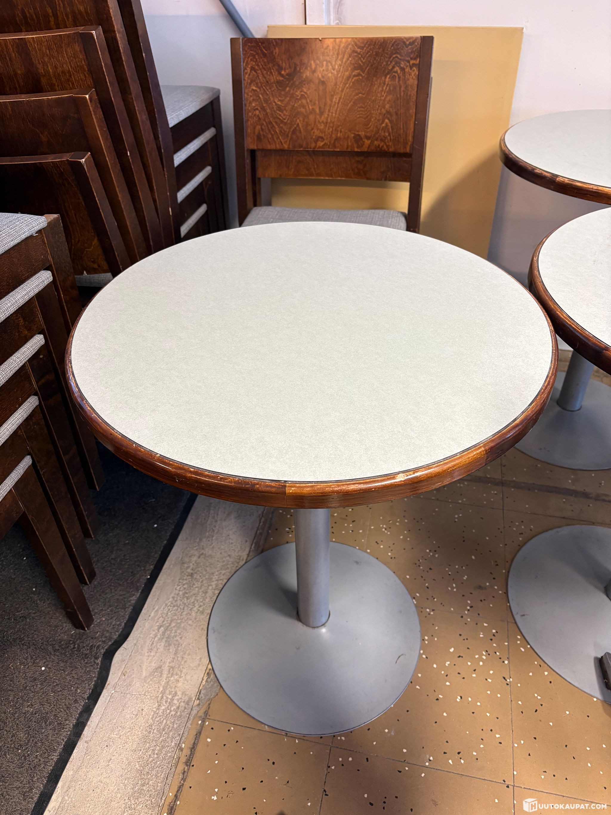 These have a greyish tabletop with a wooden edge and a grey trumpet base.