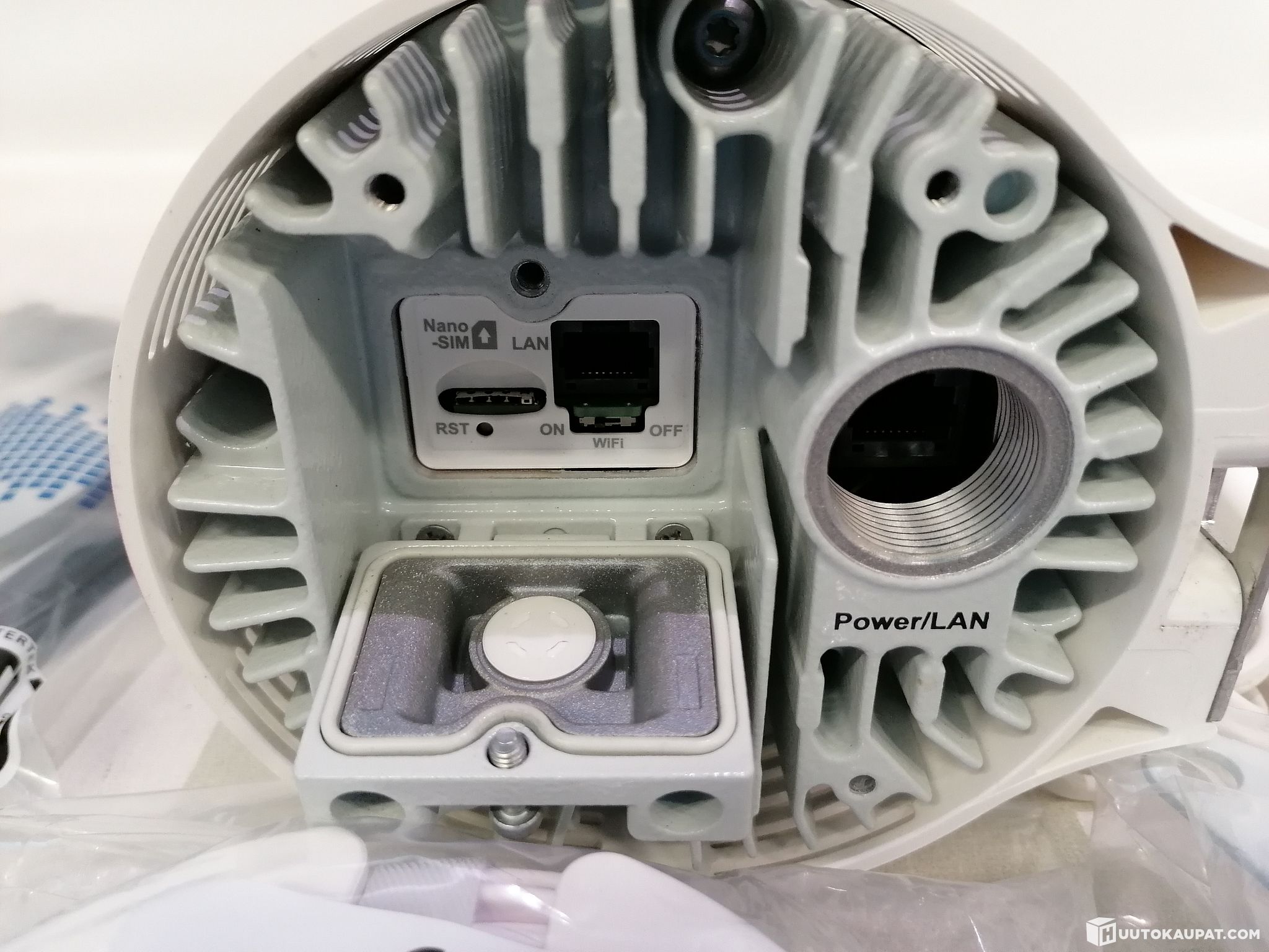 The device comes with: rear panel for wall mounting, screws for the wall bracket, 2 metal clamps for pole mounting, a PoE injector, power cable, a long Ethernet cable, a second Ethernet cable, and the gasket that fits on the underside of the device for the Ethernet cable.