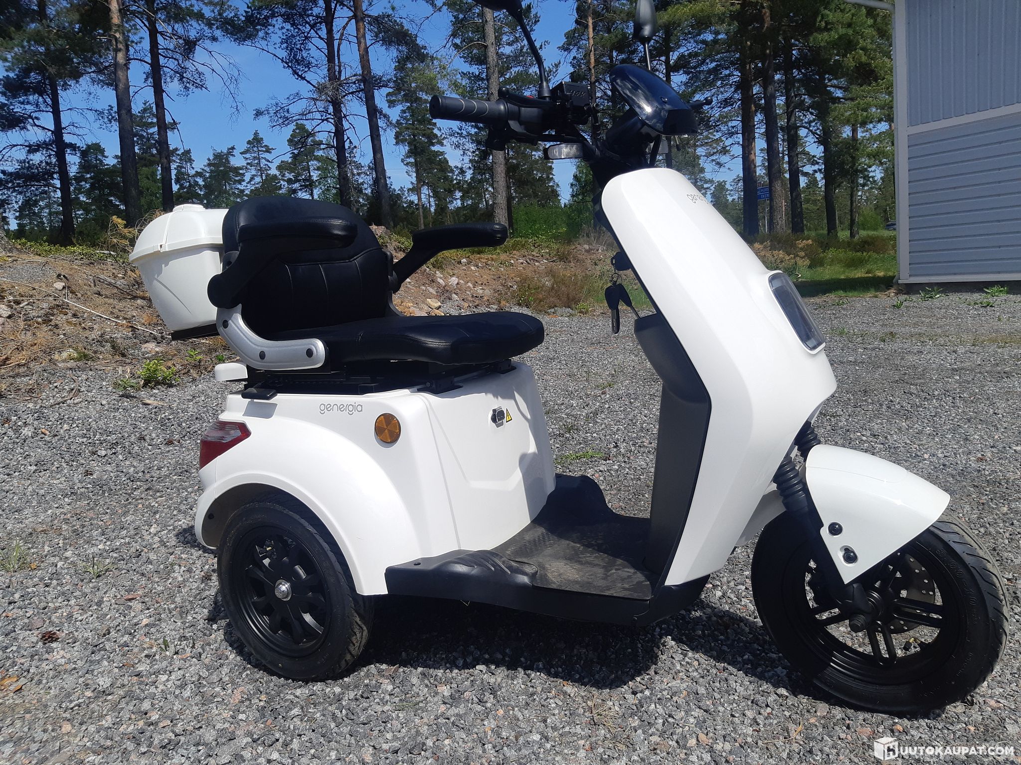 Three-wheeled mobility scooter for people with reduced mobility; can be driven without a driving licence. No registration or motor insurance required. Integrated storage box behind the seat.