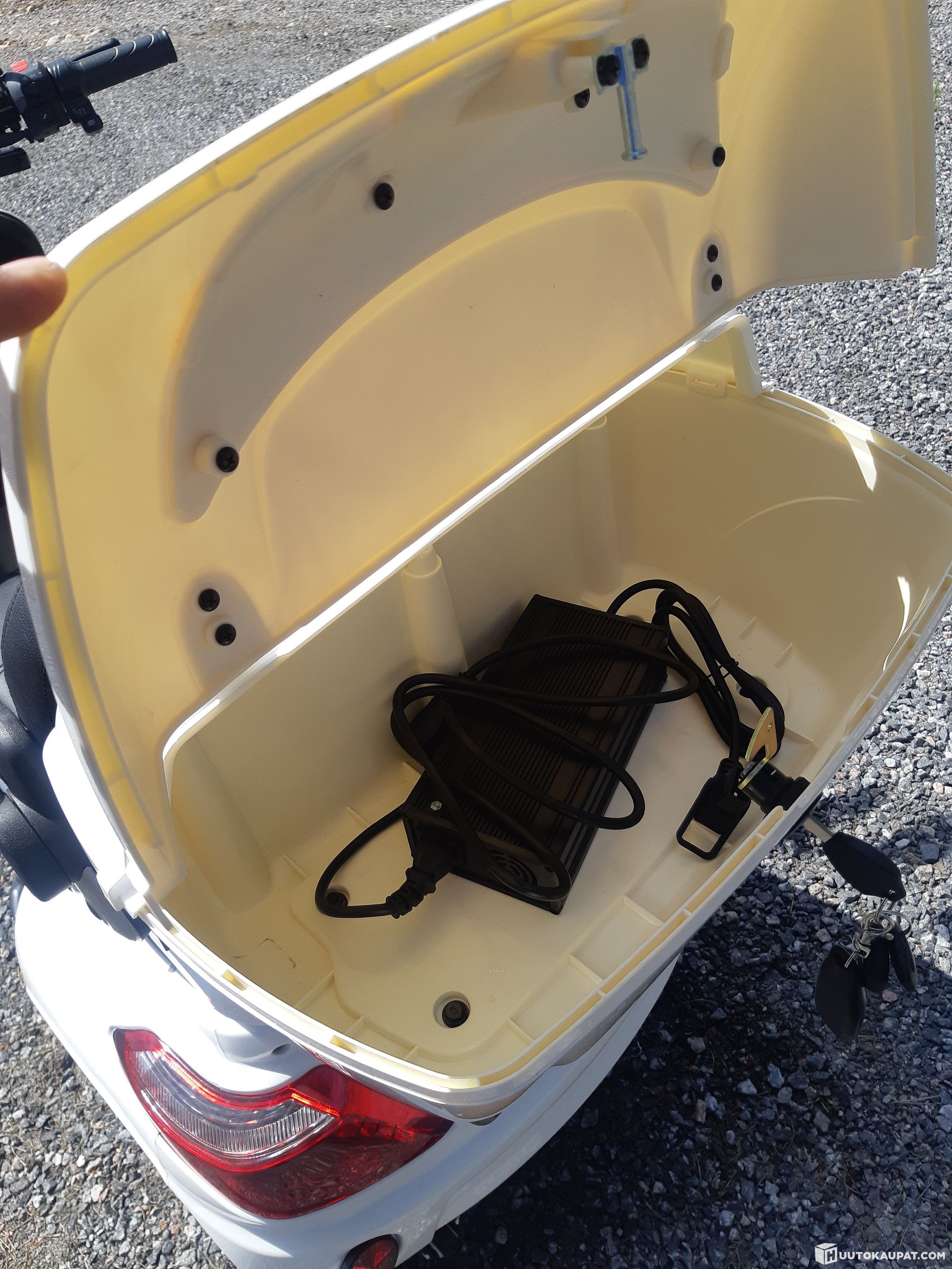 The battery under the seat can be charged in the scooter or removed and charged indoors.