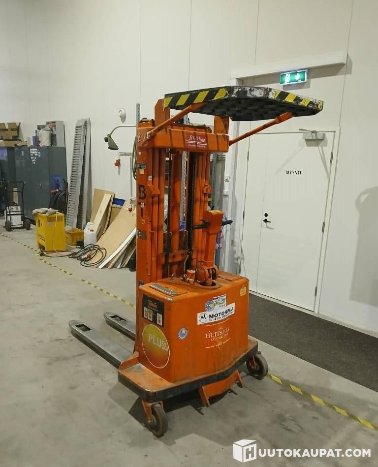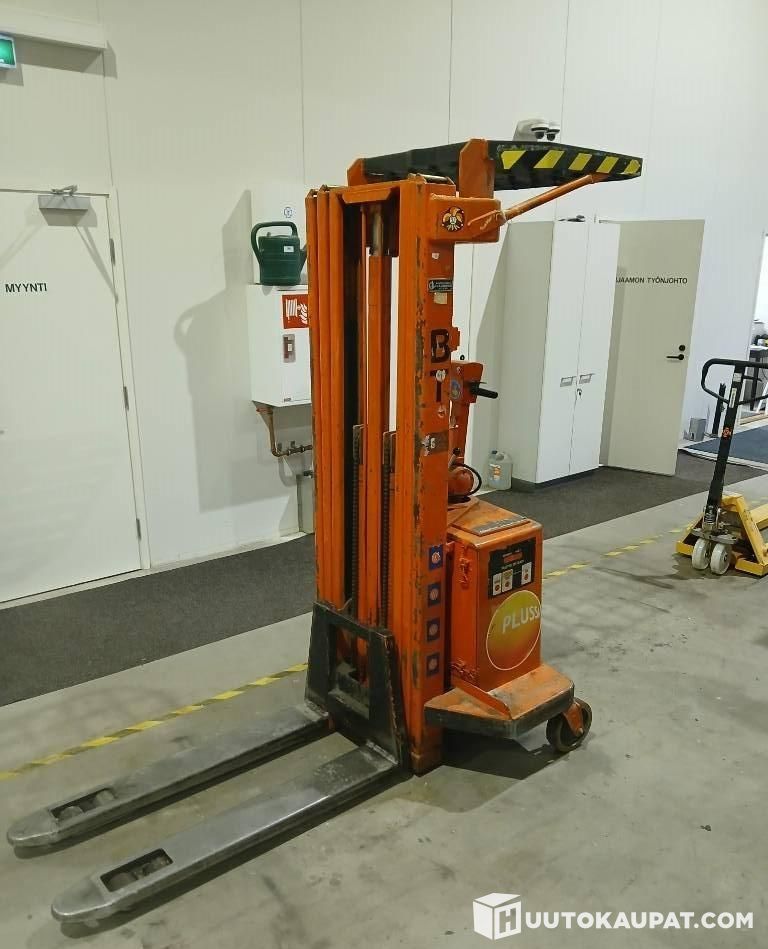 Electric-powered stacker for driving and lifting. Poor battery. Visible at Lempäälä office.