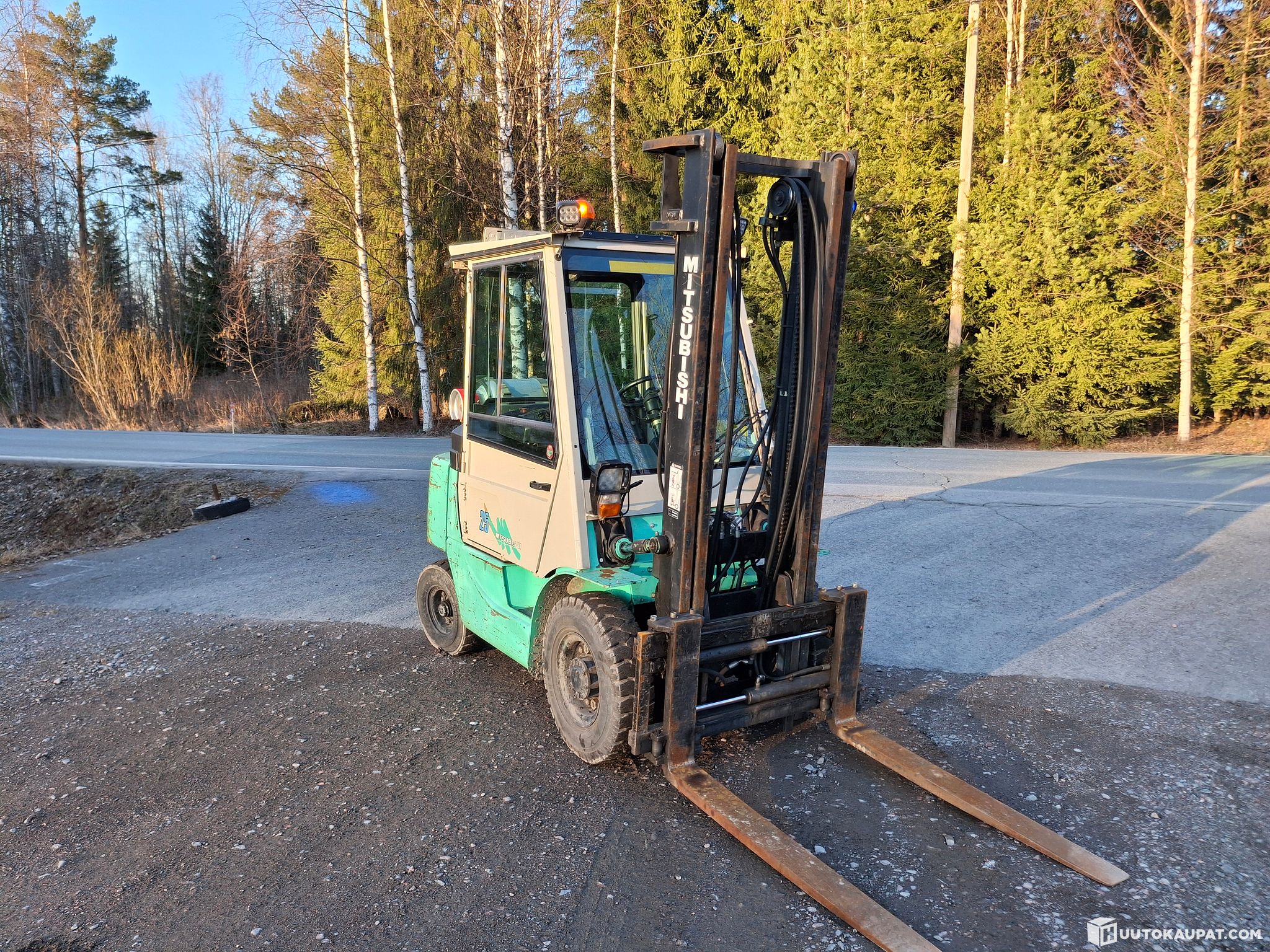 Has been with a single owner throughout its working life and has been very well cared for. Stored indoors; if even a small drop fell on the floor the mechanic would fix it immediately. Good winter tyres included for the front. The machine has hydraulic fork spread and side shift. Also fitted with a beacon, blue light, radio and scale.