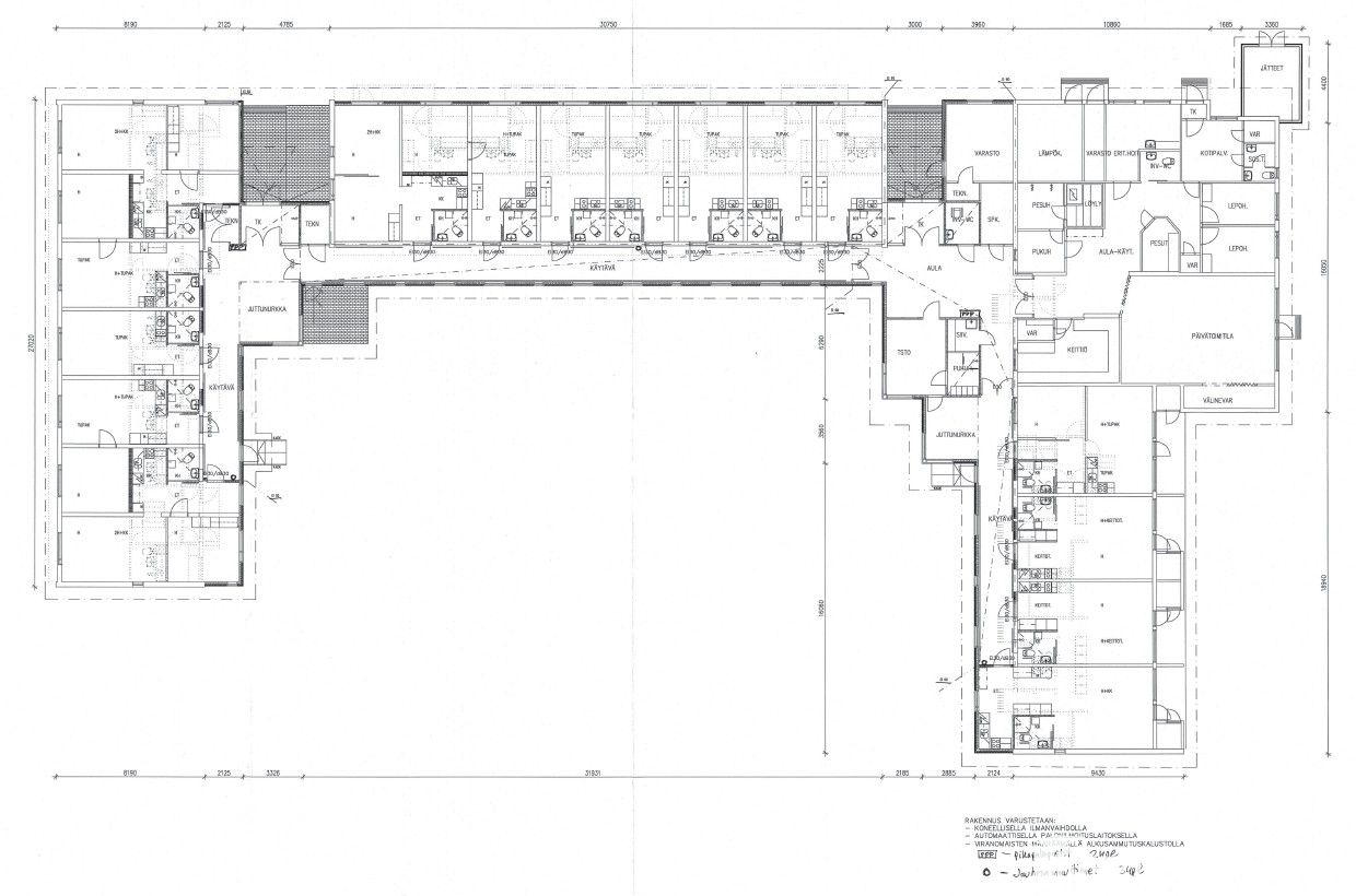 In addition to the apartments there is a large kitchen and food store, 2 rooms previously used as guest rooms, 3 units suitable for commercial use with their own staff facilities (e.g. offices), 2 small communal areas along the corridors and a large hall with equipment storage. The main building has one large sauna with shower facilities and a laundry room. The yard has three outbuildings: two newer ones with a total of 16 storage units with private entrances and an older storage building.
