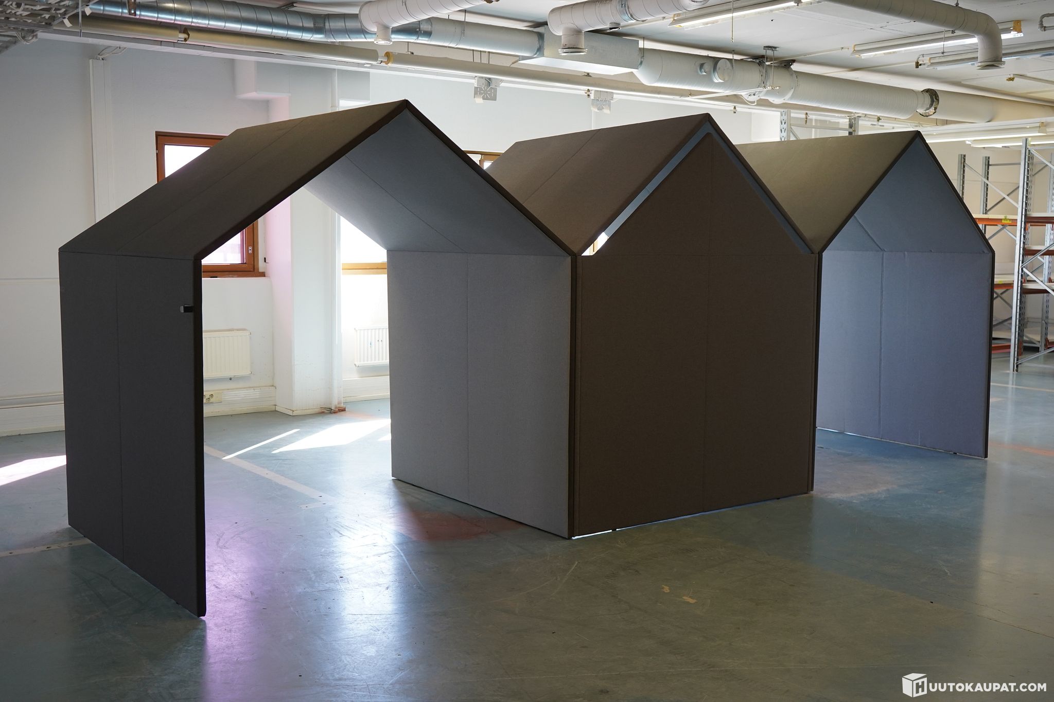 Stylish and practical modular Götessons Hut acoustic workspace. The set comprises three pods. An excellent solution for quiet work, phone calls or small meetings in the office. Modules are connected to each other with black brackets.
