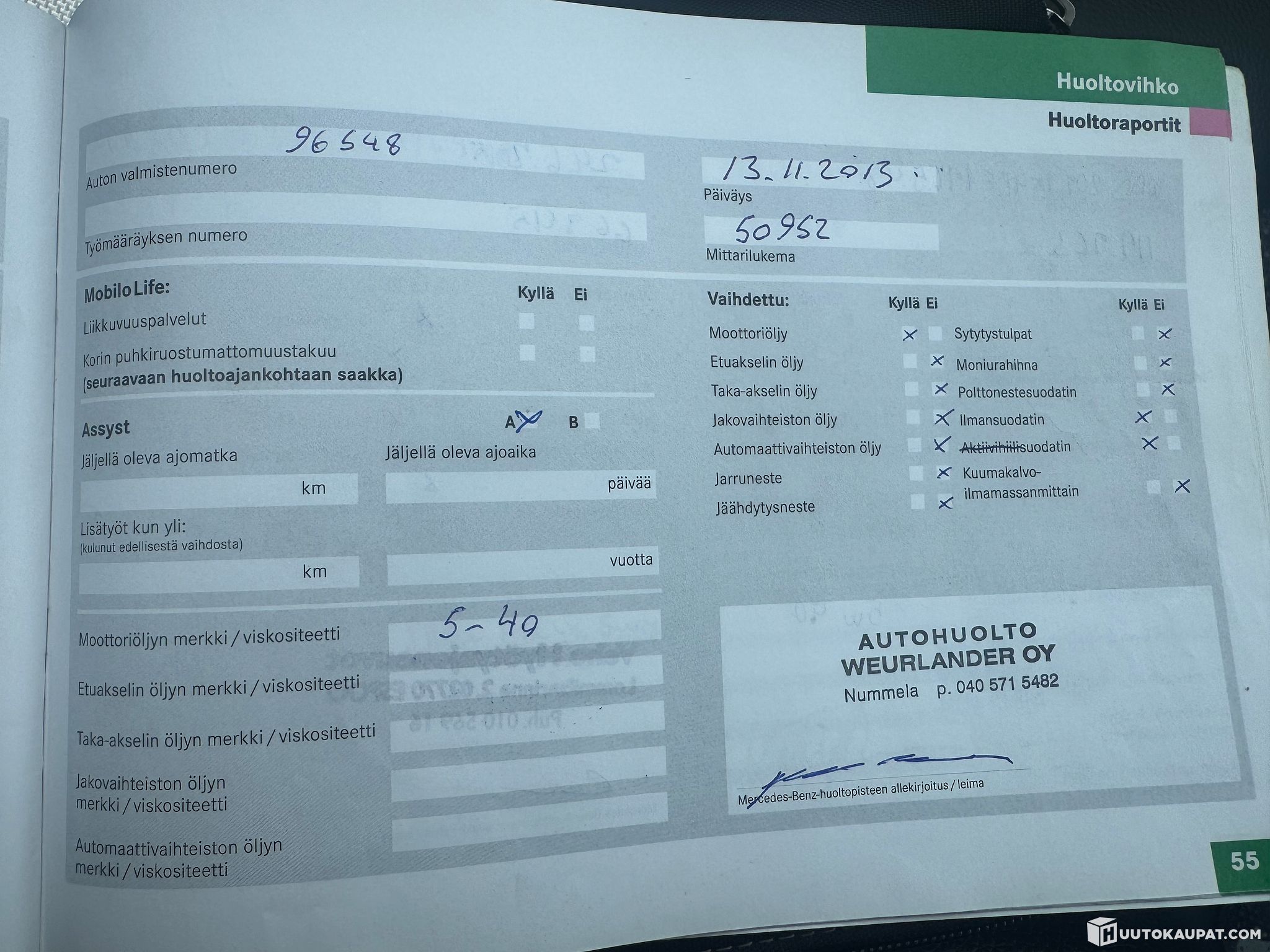 The car was originally sold new in Finland and has a complete service history. Three oil changes are recorded in the service book without a stamp; there may be unstamped services in the electronic system (not checked). Otherwise all services were carried out and stamped at a garage.