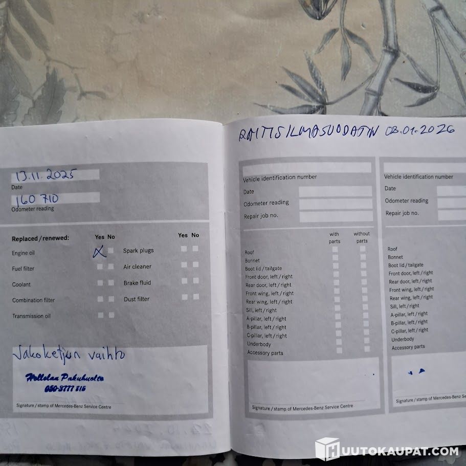 In 2025 / from 159,595 km: rear brake backing plates + discs + handbrake shoes + calipers and wheel hubs/bearings. Battery, serpentine belt (one small tear), spark plugs, fuel filler pipe, air conditioning service, timing chain replacement.