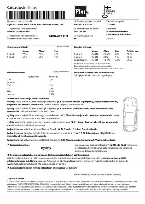 A sensible Toyota for its mileage — failed inspection with a list of faults.
