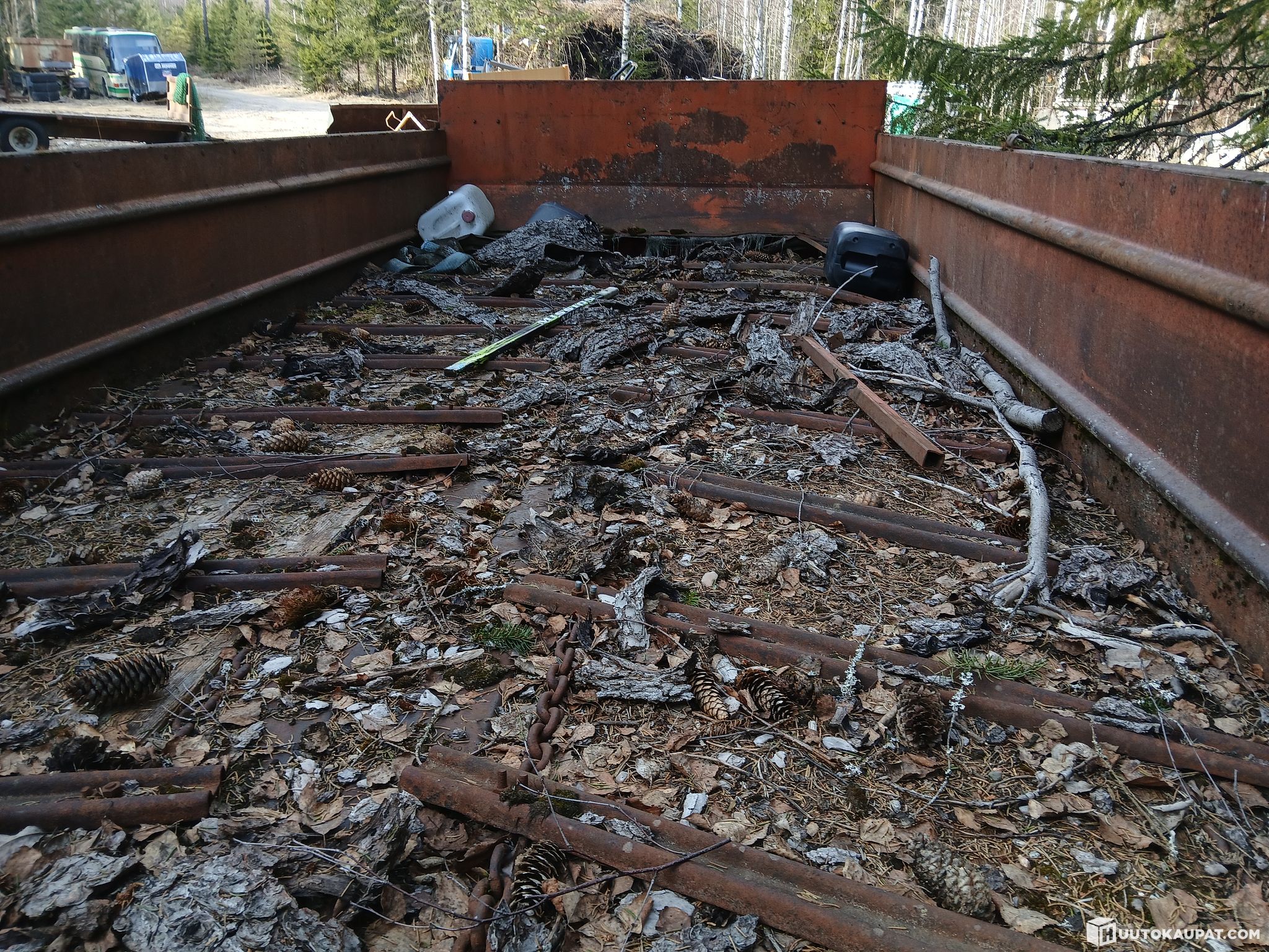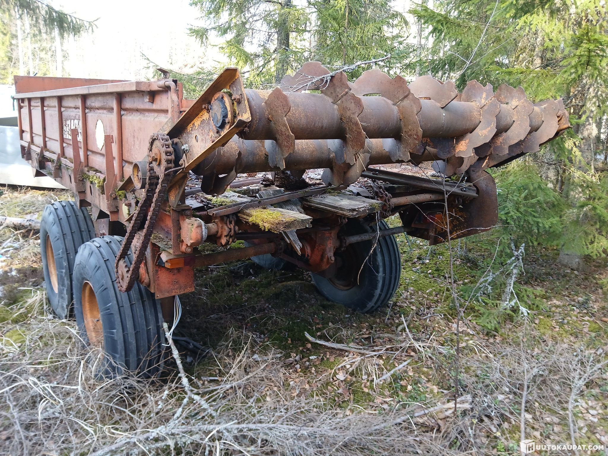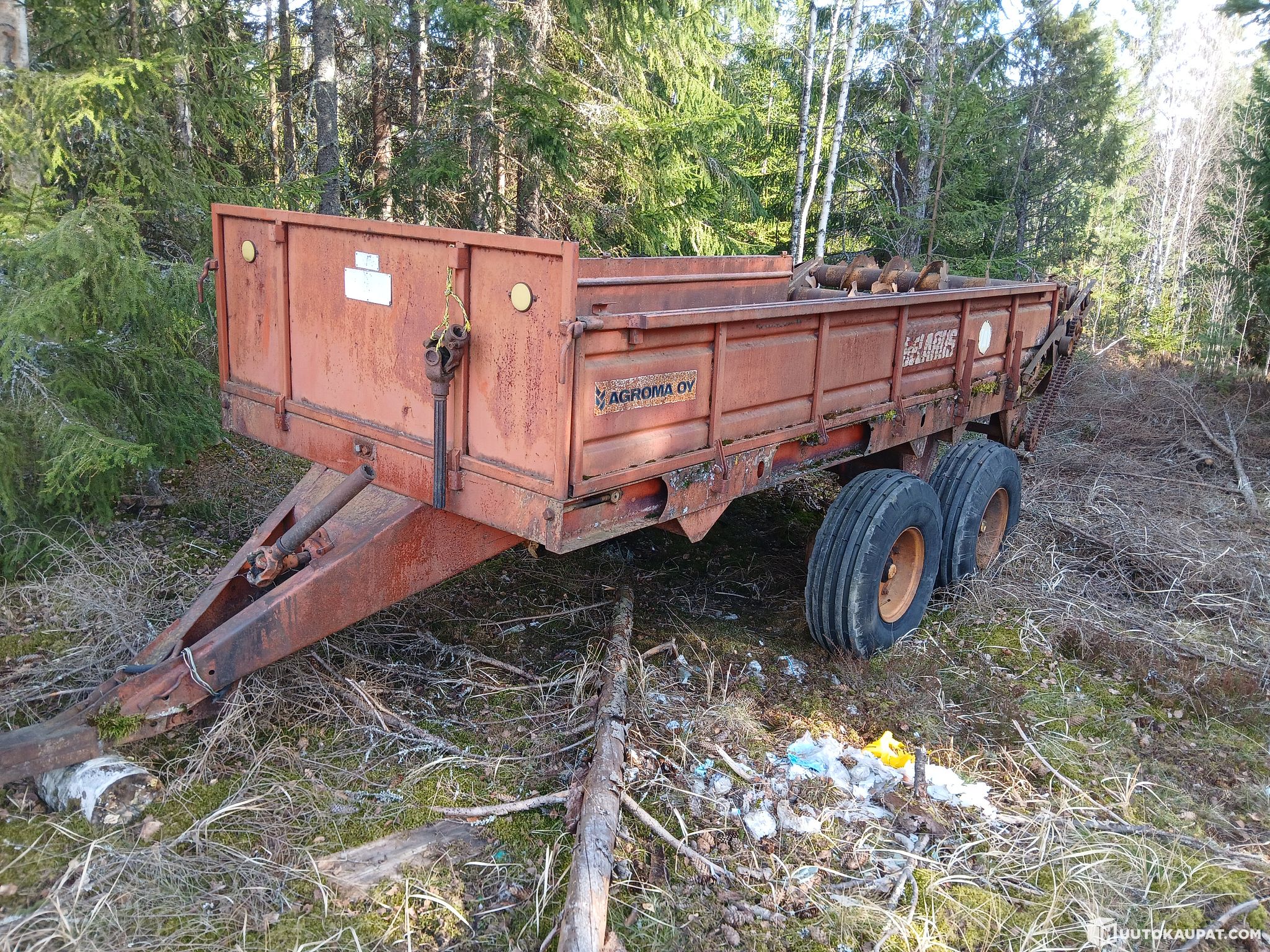 Wood-floored tandem trailer for repair. Wasn’t used by me. Tyres need air. PTO shaft included. Condition of the beater unknown. Floor completely rotten, chains have been running unevenly. Welded and repaired. Bought as a woodchip-trailer project but never finished. Delivery can be arranged for an extra fee. Best to come and see what you buy to avoid disappointment.