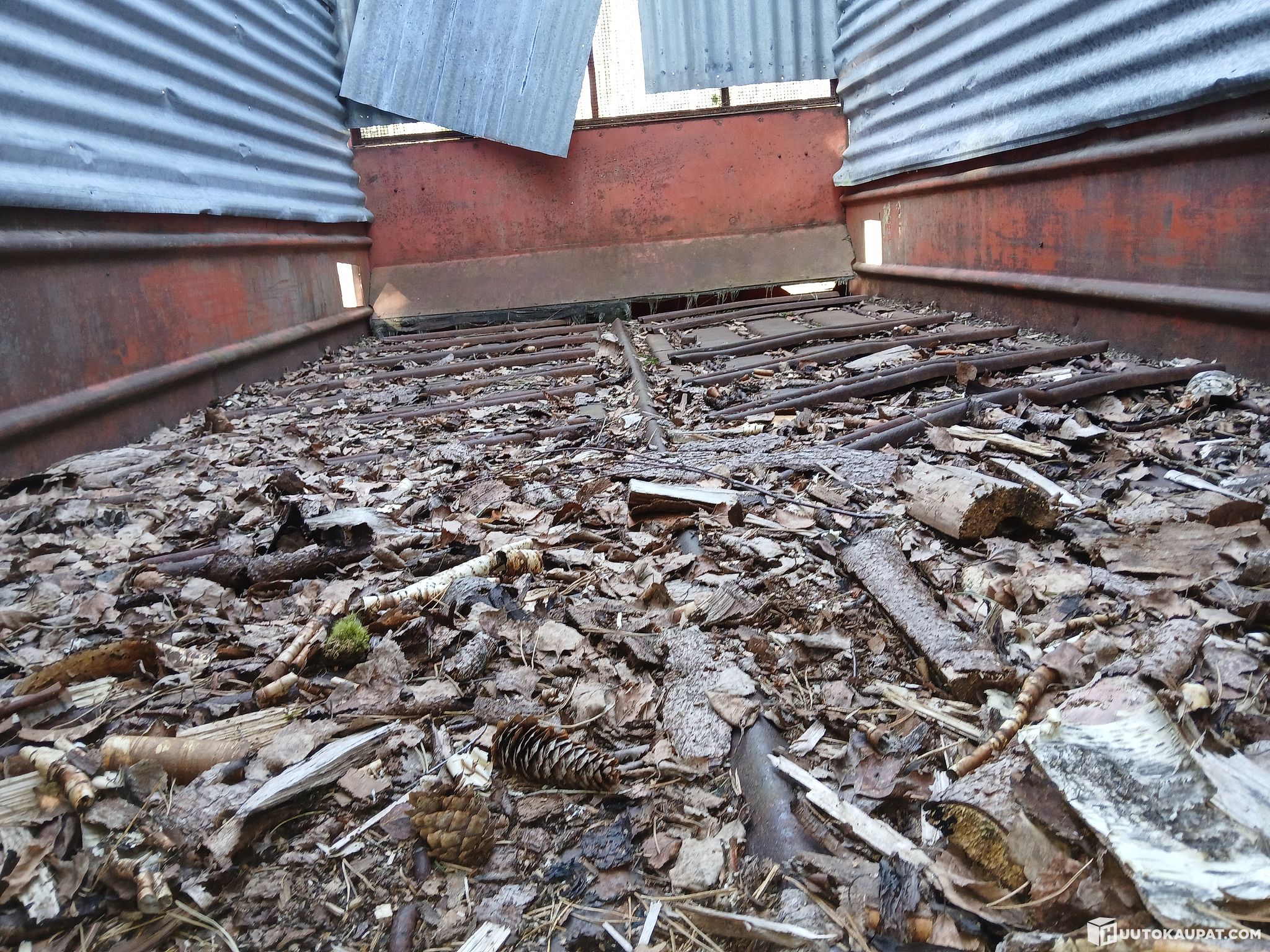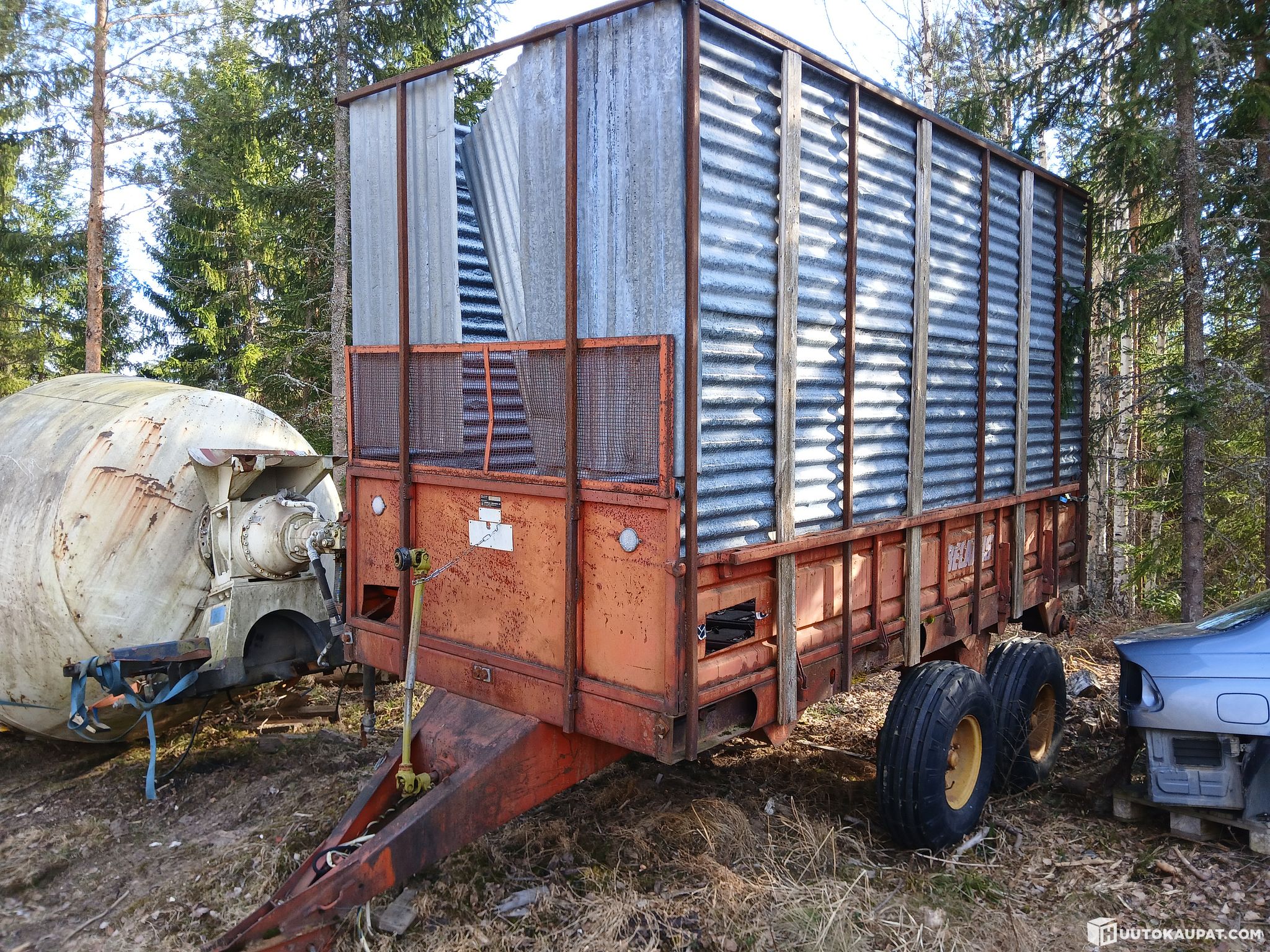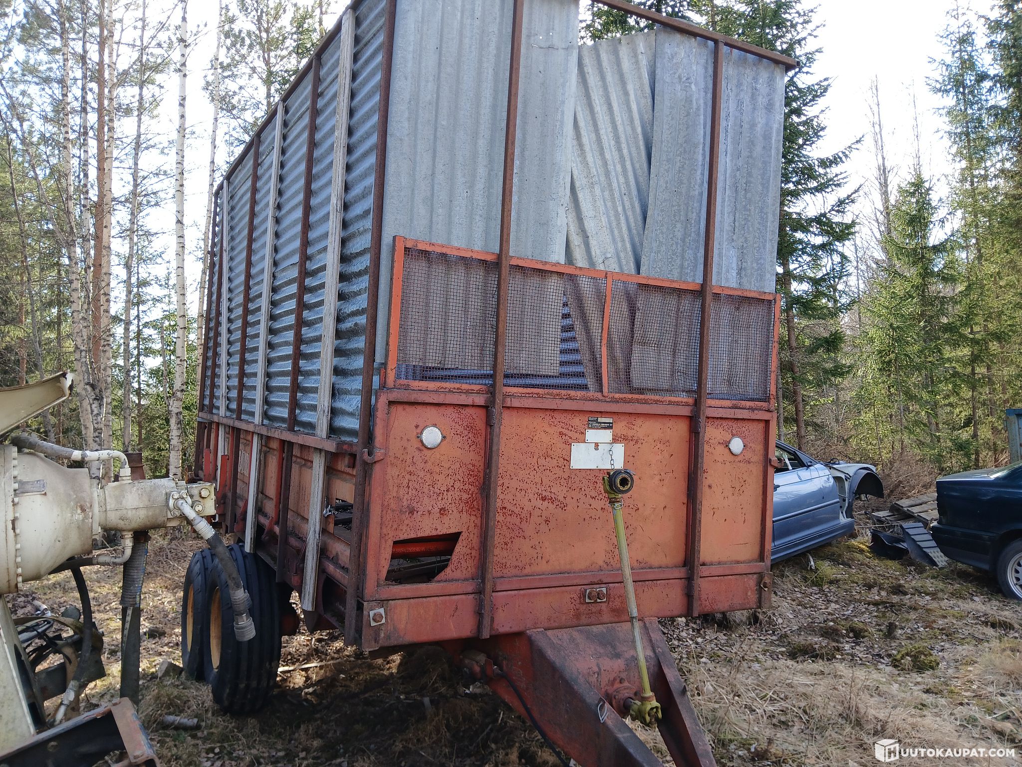 Converted from a muck trailer into a woodchip trailer. Sheet-metal floor. Capacity roughly 16 m³. Chains sometimes skip; driveshaft (PTO shaft) included. Tyres intact. The trailer has seen very little use since conversion for woodchip work, and even then was seldom used. Unloading still operates via its own ratchet mechanism driven by the PTO. Needs at least chain adjustment. Last used as a firewood trailer a few years ago and ventilation holes have been made in the front corners. No lights are working. Rear spreader has been scrapped. Sold as redundant. Transport can be arranged at extra cost.