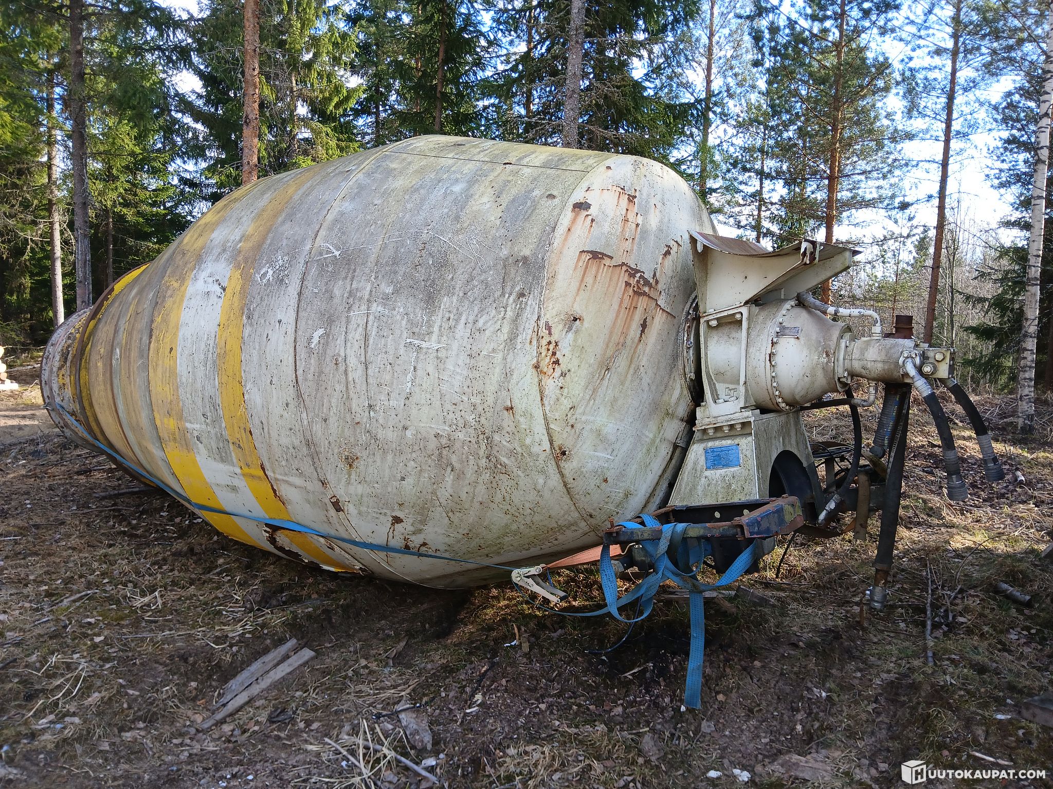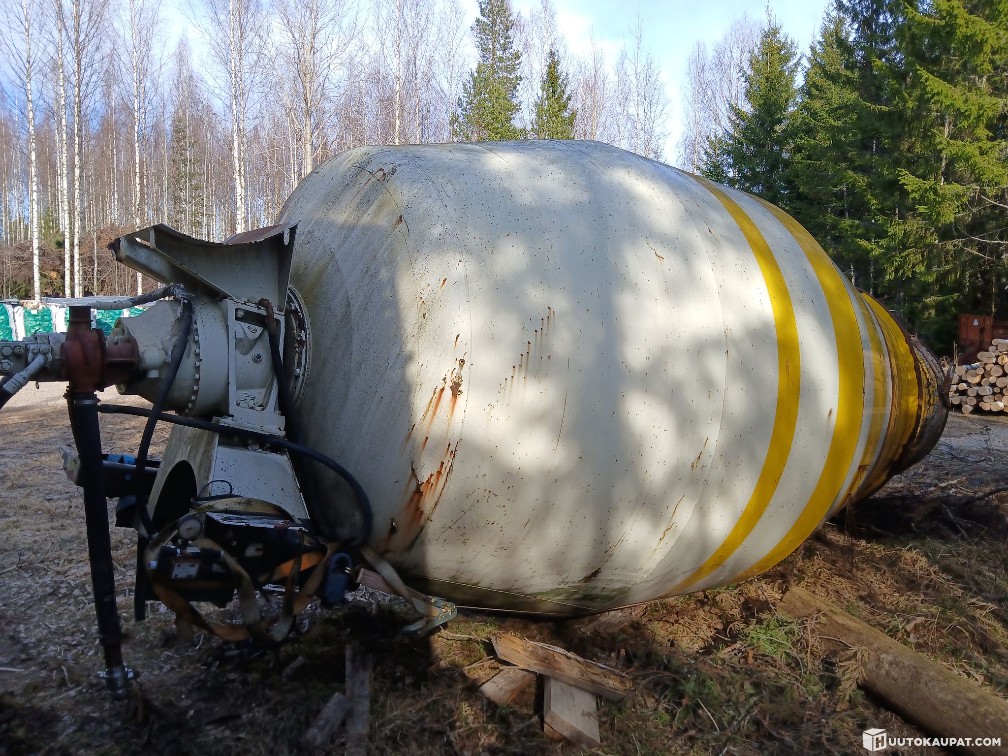 Concrete mixer 8 m³. Fitted with adapters to the rear support to mount on a Sisu tipping axle. Two-part chute approx. 4 m. Parts are separate. Some parts welded and reinforced, blasted and primed — ready apart from assembly. Left unassembled due to moving. Hydraulic parts, pump etc. are included. Removed from a 4-axle Sisu. A little concrete at the drum opening and a small amount inside at the front. Quite solid and sturdy-looking; one dent is visible in the pictures. Flatbed transport can be arranged for an additional fee. Worth viewing in person so you know what you are buying. Not in use by the seller.