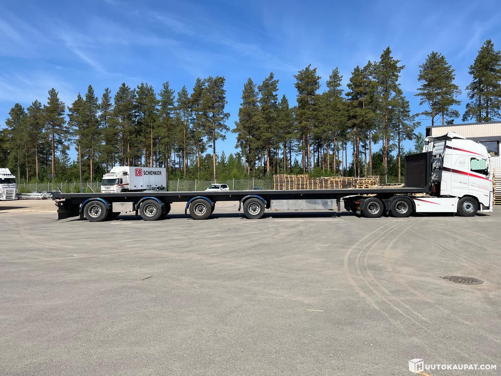 For sale: a Tyllis-made 18 m long 4-axle trailer. Over the years the trailer has undergone repairs, e.g. replacement of the plywood floor, kingpins, air springs and sandblasting.