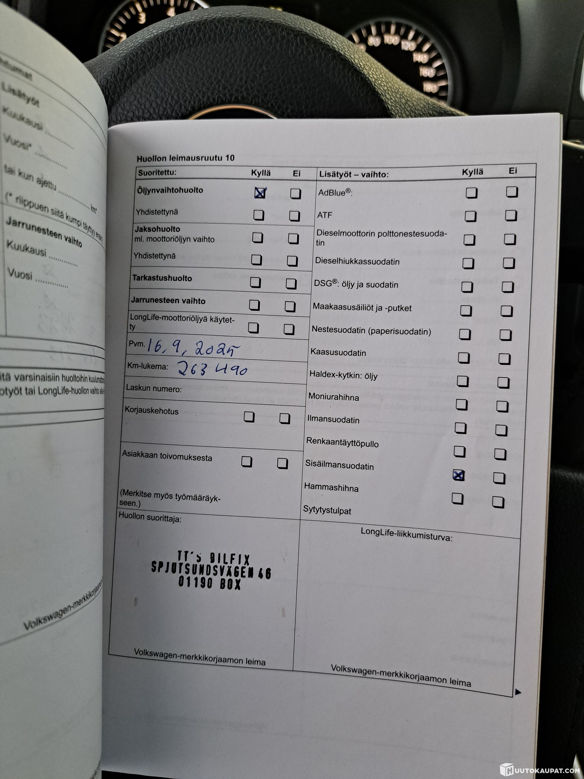 High mileage but surprisingly pleasant to drive. The body shows plenty of stone chips, a few scratches and some rust. The service book is present and filled in. Latest entry September 2025, 263,000 km. It appears the car has already passed the service interval by distance, as the on-board computer is requesting service.