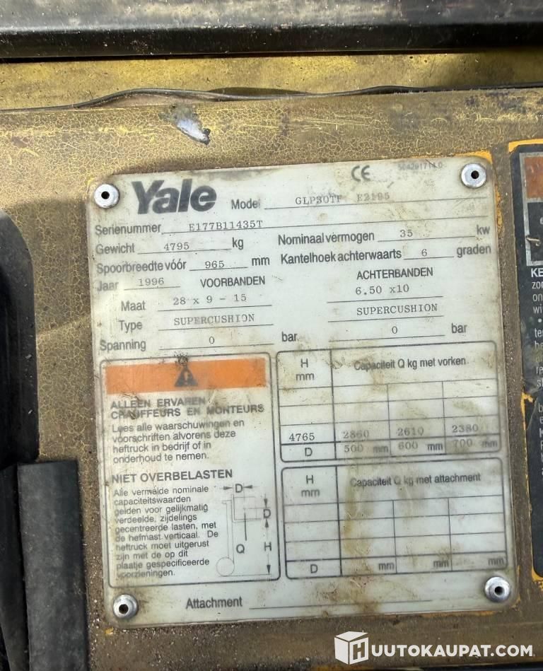 Operational 3 t Yale gas forklift, taken directly from use. Forklift available to view at the Lempäälä branch.