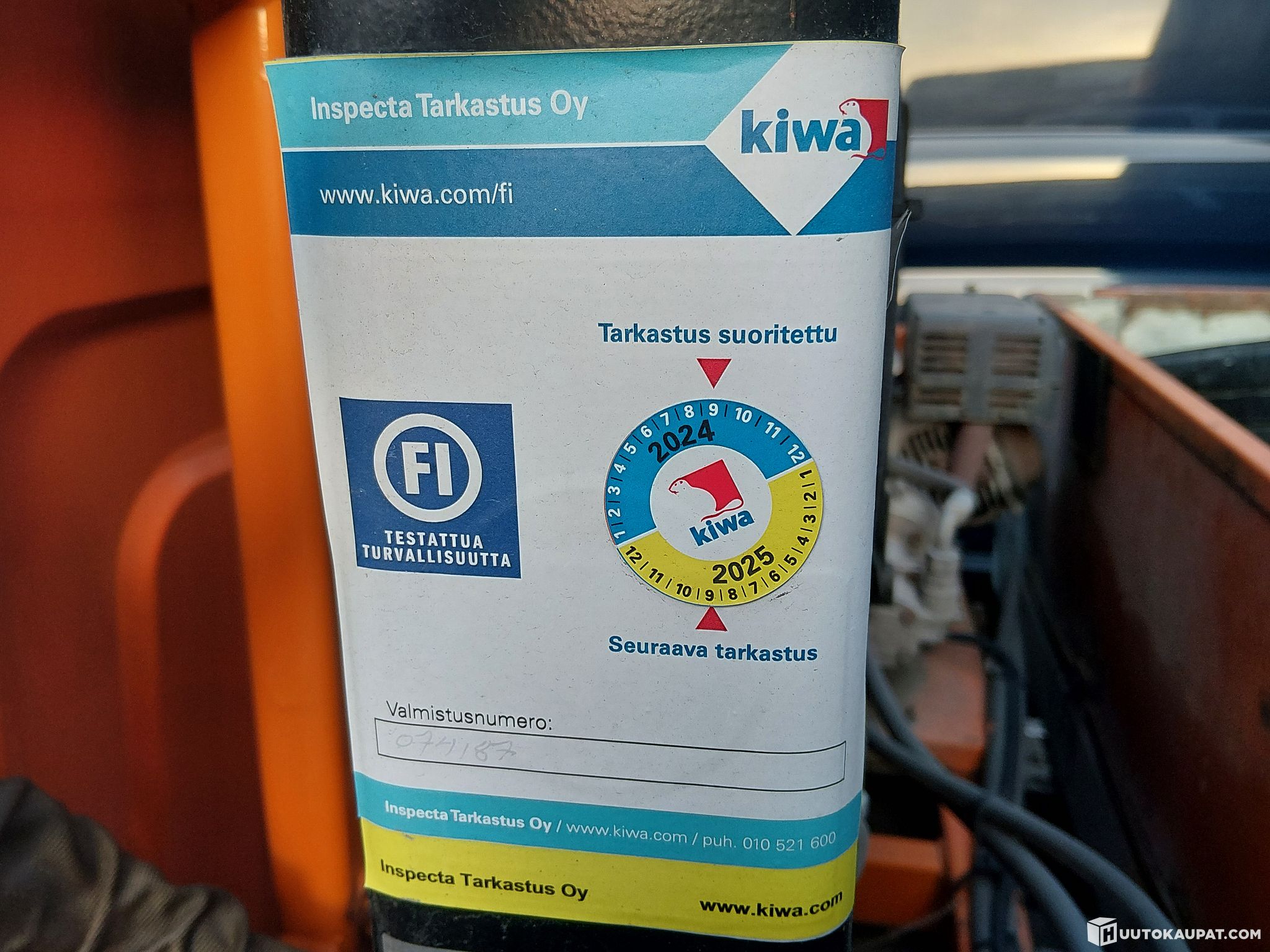 The loading crane was last inspected in September 2024; the 10-year inspection has not been carried out. The crane's drive engine has been deactivated by removing the small combustion engine's starter coil; the coil is included with the vehicle.