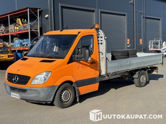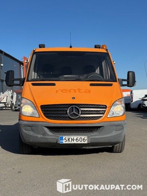 Flatbed Mercedes van fitted with a crane. Raju Ferrari 515 crane. The vehicle is over-wrapped in orange; the wrap is already sun‑faded. There may be an undamaged paintwork underneath?