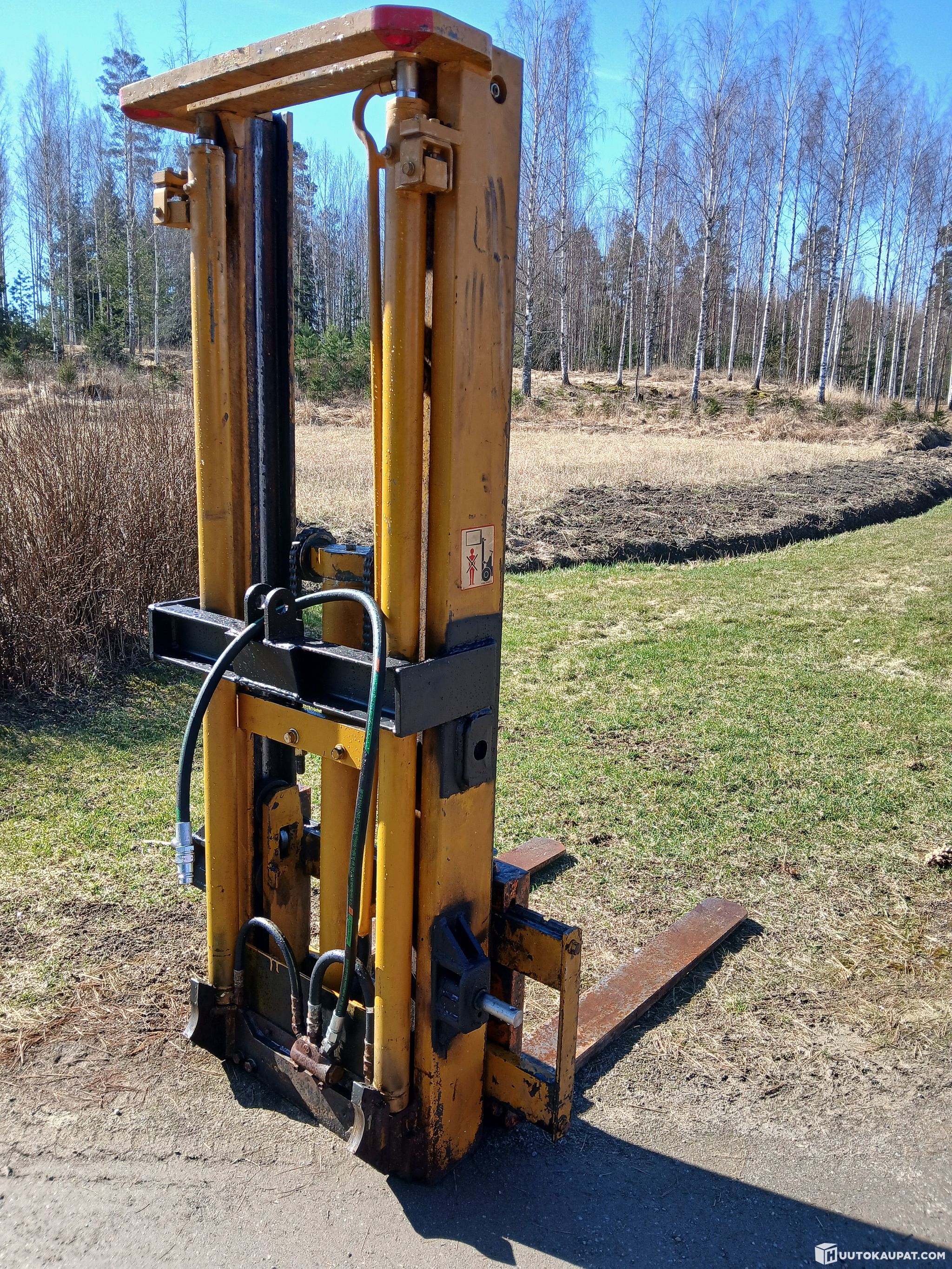 Forklift mast built from a Toyota electric forklift mast for tractor linkage — can be fitted to rear pockets or to the front. It could also be connected to a front loader or adapted to the front of a small loader. Forks have manual lateral adjustment; forged-steel tines. Fork length 1,100 mm. Mast height only 1,900 mm, so it fits through lower doorways. It is a low-lift mast: it raises the tines to the top of the mast before extending the inner section, giving good visibility of the tines. The mast's lifting capacity as a forklift was 2,000 kg — it will certainly take more. Fixed tines rated 2,500 kg. The mast raises the tines to 3,300 mm from the ground measured with the linkage in mid-position (about 300 mm). This allows lifting somewhat higher loads, or attaching a work platform to the tines for painting/repair work or other lifting tasks. When connected to a tractor it can reach tighter spots for lifting goods. Cylinders are dry and not leaking; overall the mast is in tidy condition and ready for use. The mast operates up/down with single-acting hydraulics, which are available on all tractors, so it suits both older and newer tractors front or rear. The mast can be loaded onto a truck with a forklift free of charge at collection. It transports well on a car trailer when laid down. The mast can be tipped onto the trailer bed at collection. Collection times can be arranged very flexibly, including evenings and weekends. No collection fees apply and there is no rush — times can be agreed flexibly if needed.