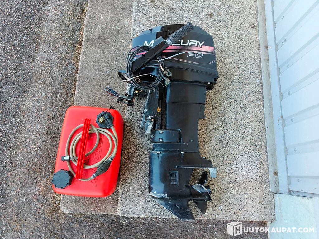 Well-maintained Mercury 20 outboard motor with manual throttle and an external fuel tank. A fuel hose with primer bulb is included.