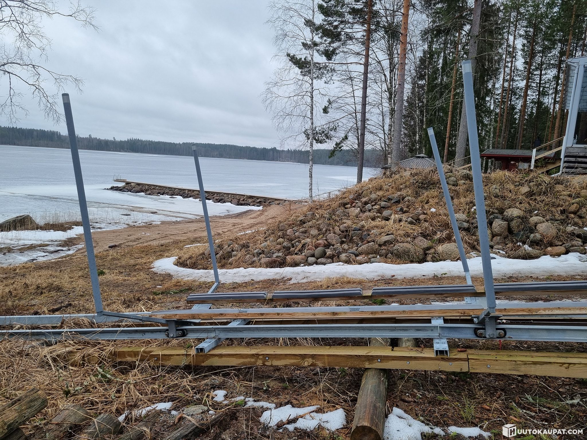 Dock length 20 metres. Electric winch. The dock has been used to dock a 1,200 kilogram boat. Trees visible in the pictures are included.