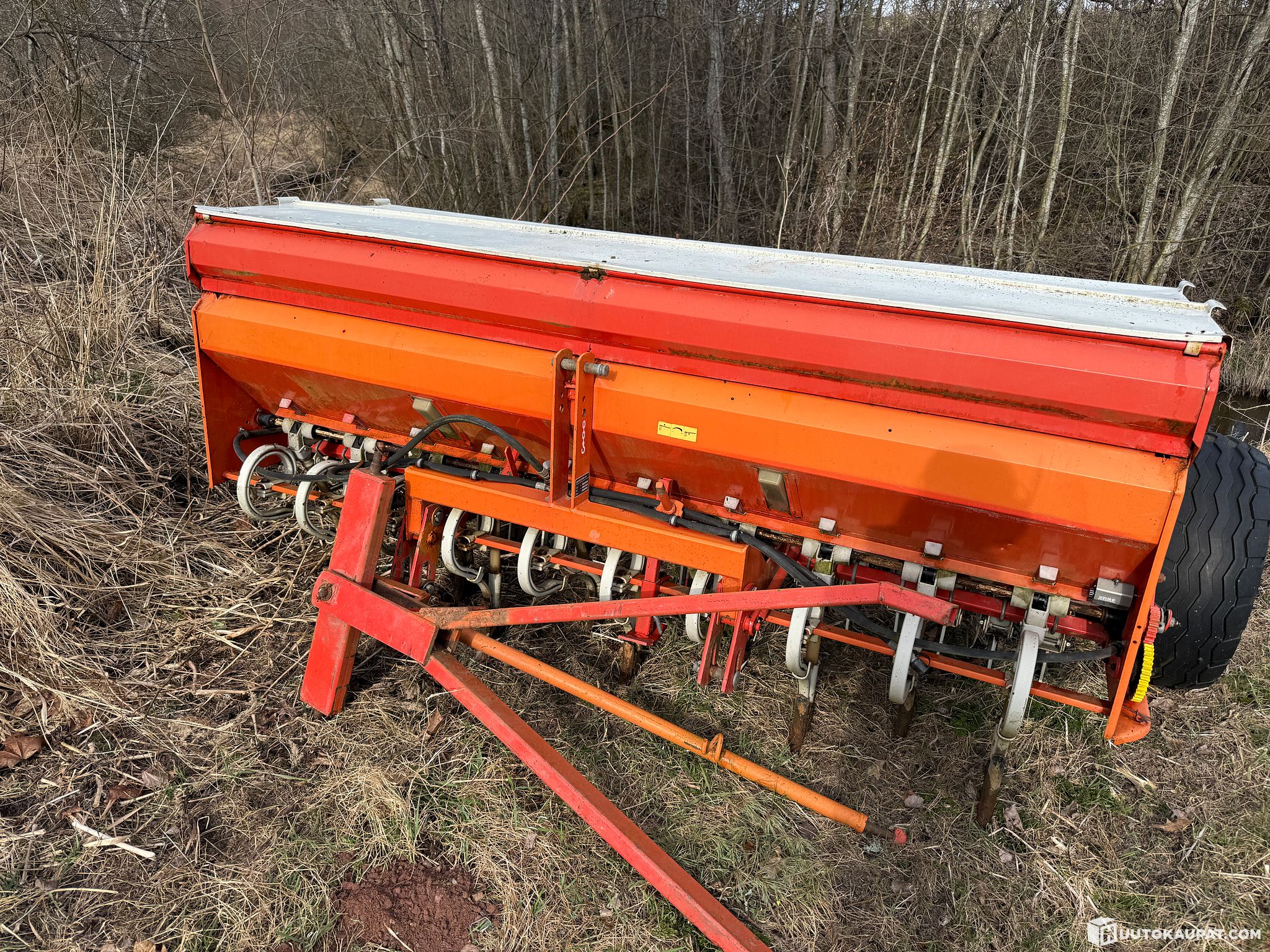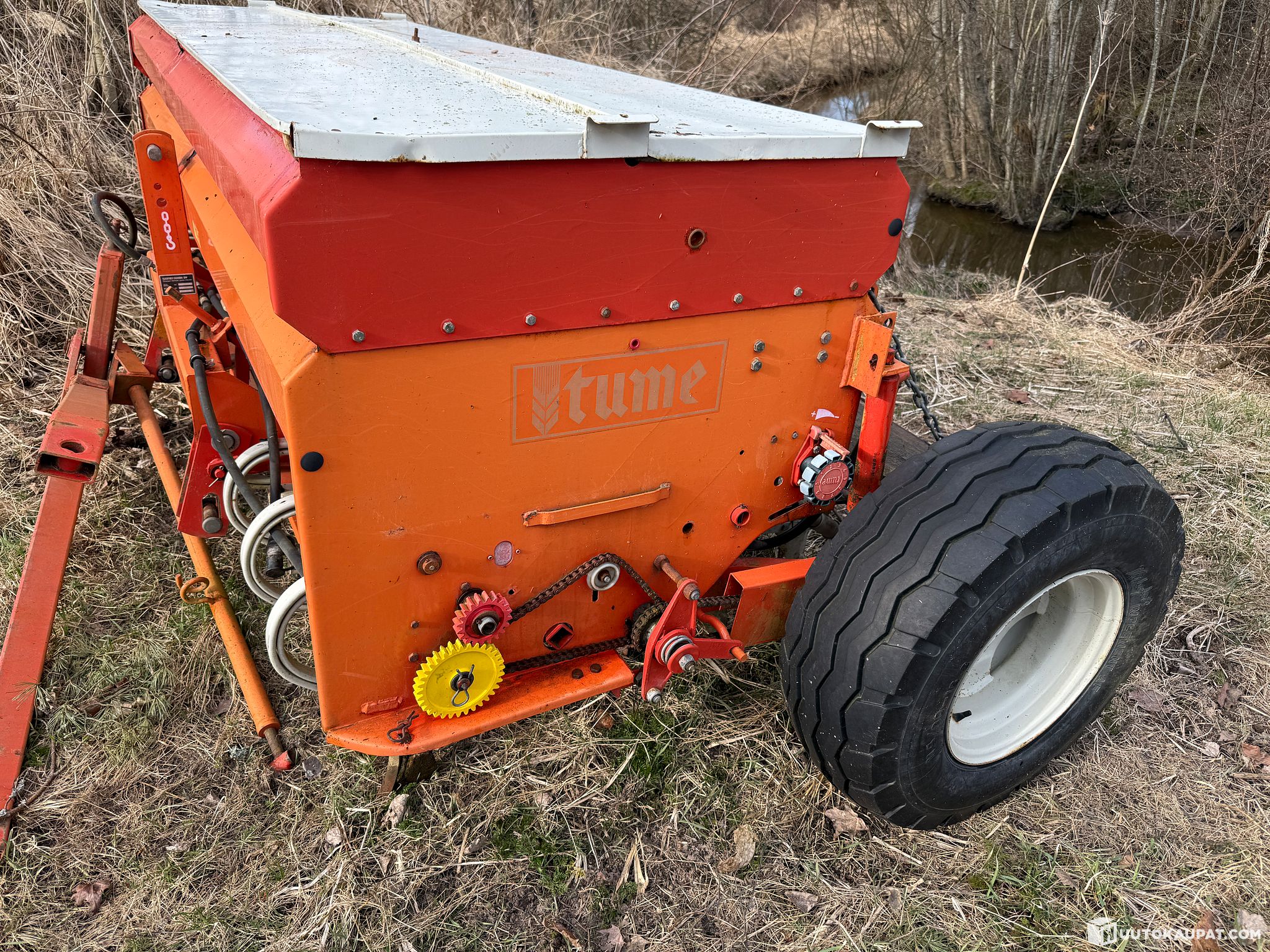 This Tume pull-type seed drill is offered for spare parts, restoration or as the basis for a project. I bought it a few years ago as a donor for spare parts but never needed it. Acquired from the previous owner as a working machine. Gears, chains, the hopper plate, fertiliser and seed tubes and other parts are suitable for spare parts use. The sowing and fertiliser tines are on their last legs, but still usable.