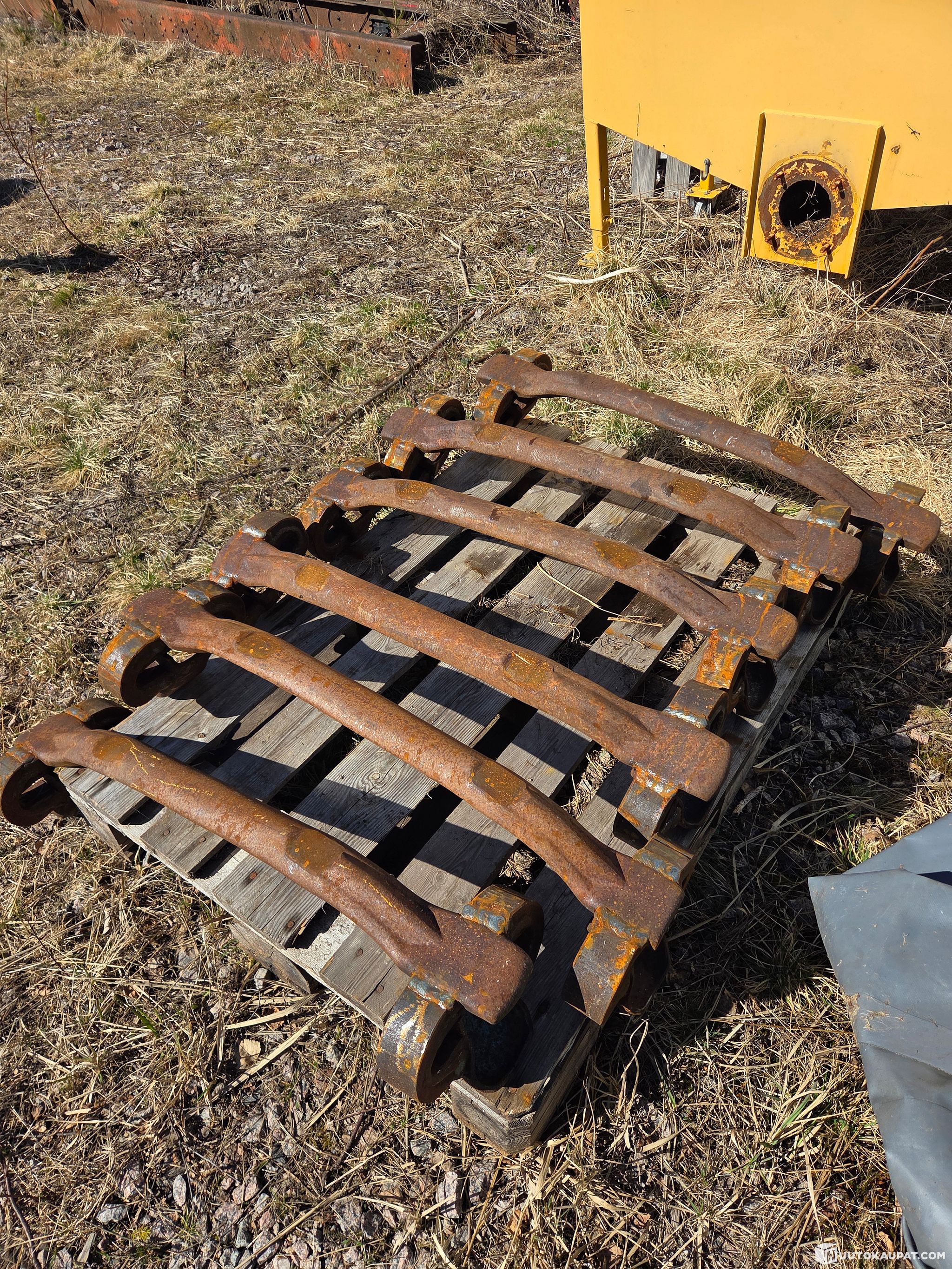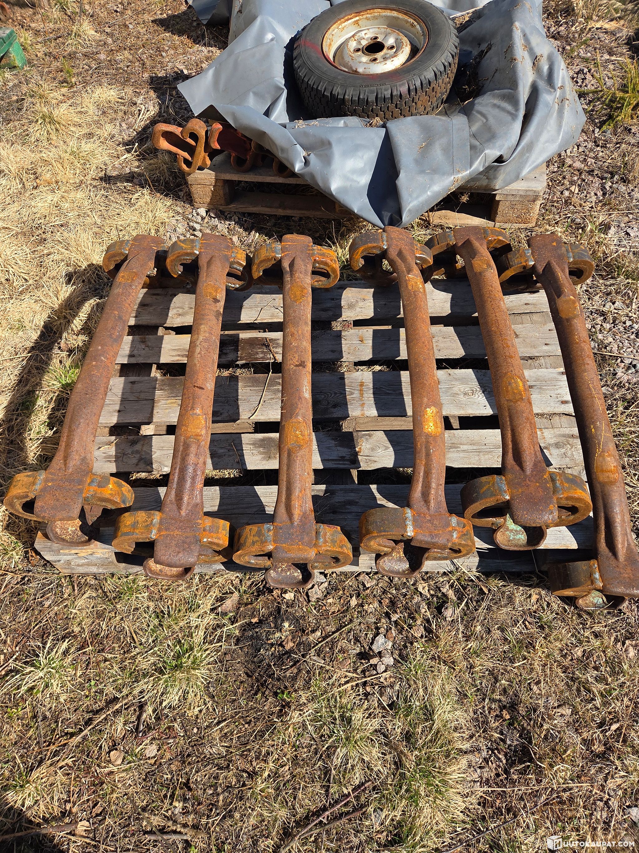 Six refurbished forestry machine track shoes from an auction.