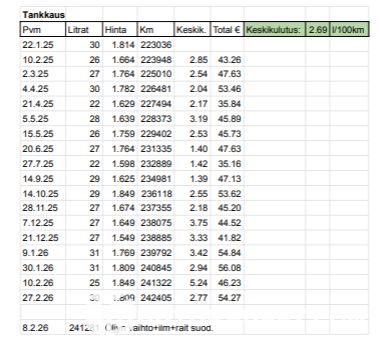 Yes, Viimeisin huolto 8.2.26 öljynvaihto + suodattimet edellisen omistajan toimesta