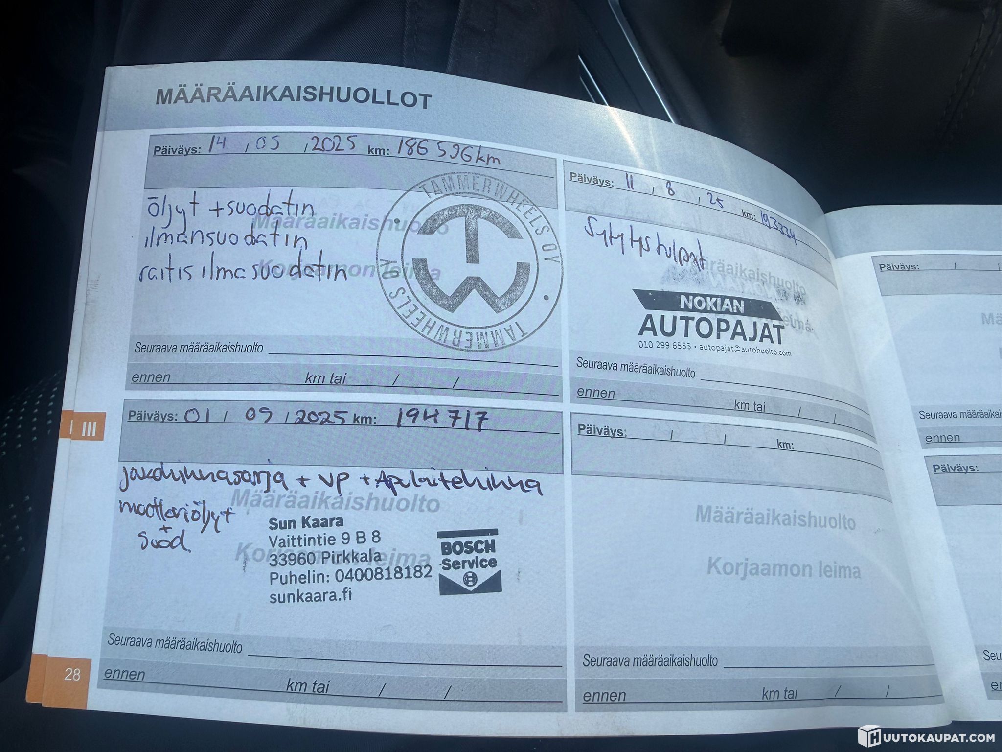 Here is a great Finnish Peugeot for its next owner! The car has two sets of tyres on alloy wheels. For winter: Hankook studded tyres; the summer tyres are unused. A major service was carried out in September, including a timing assembly repair and the regular scheduled service. The brakes were also replaced in 2024!