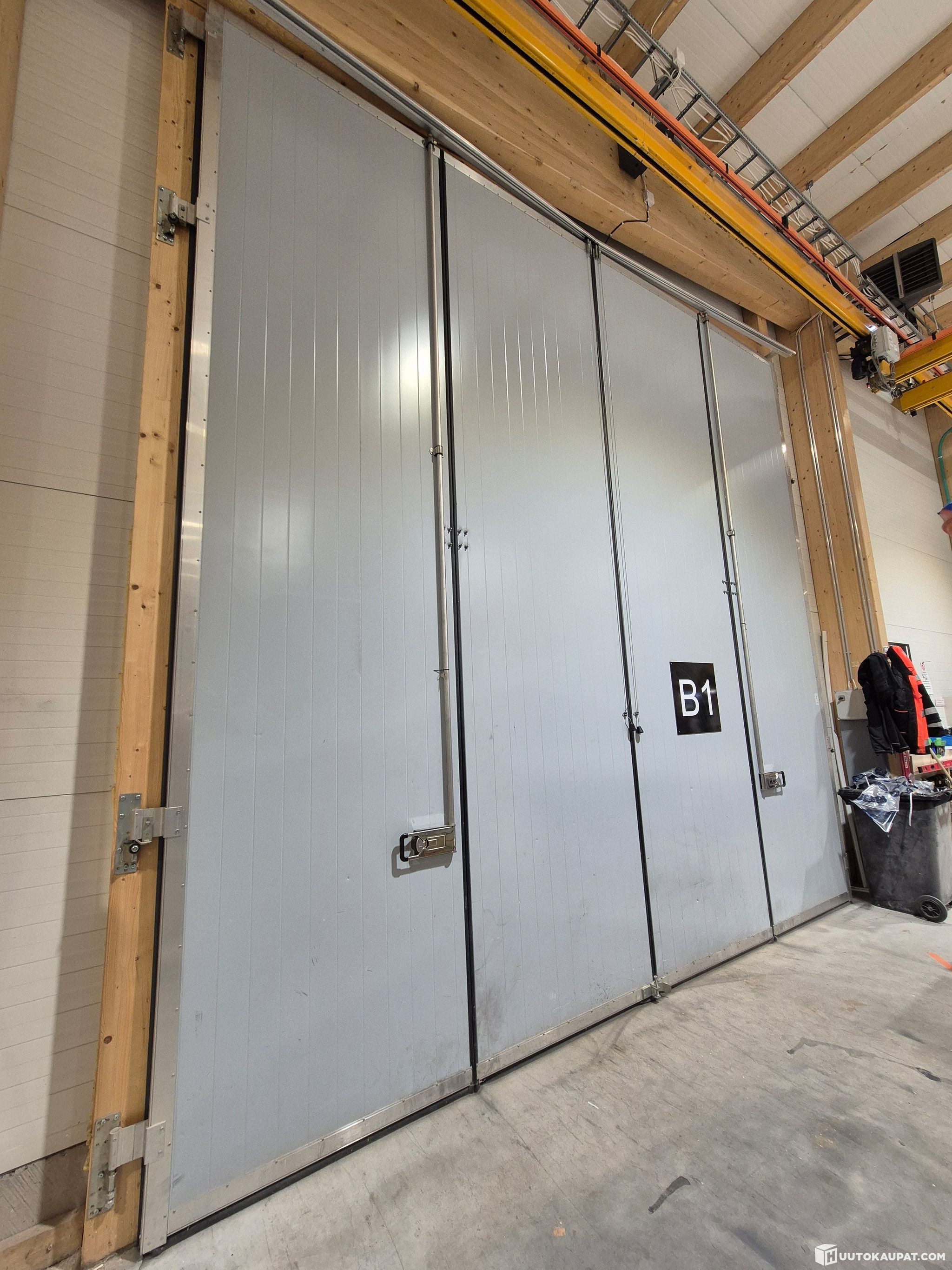 The door was in use for one year, after which it was replaced with a larger door. Functional; the door has been stored outdoors. Opening width 5.00 m, height 5.05 m