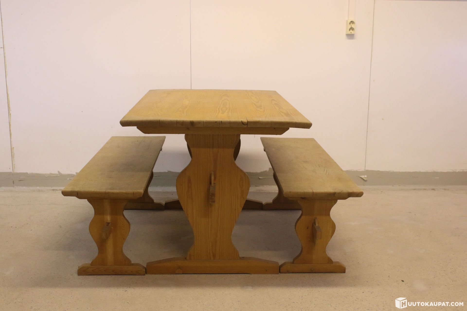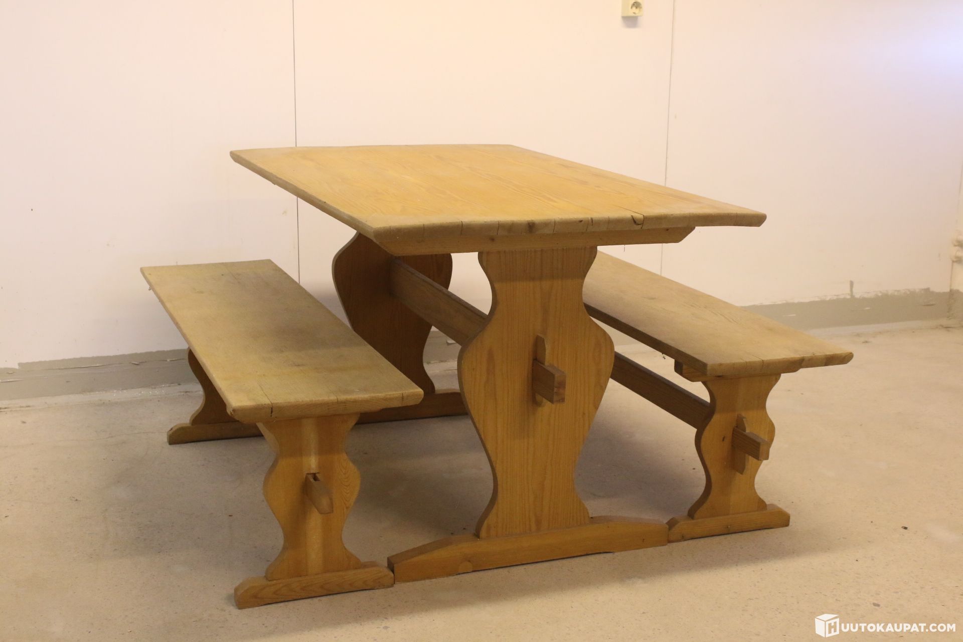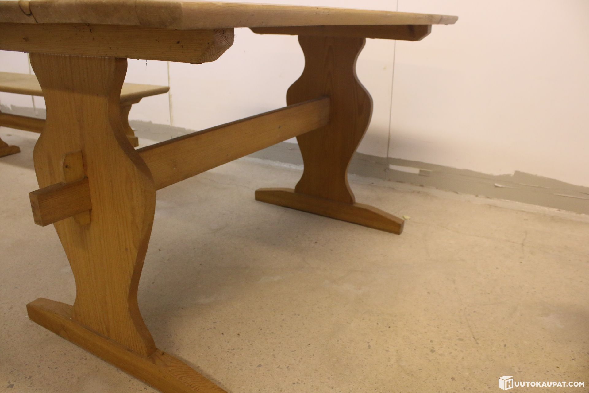 For sale: an impressive and very sturdy solid wood farmhouse dining set. The set includes a spacious farmhouse table and two long benches. The furniture has attractive traditional cut details on the legs and is very robust in construction.