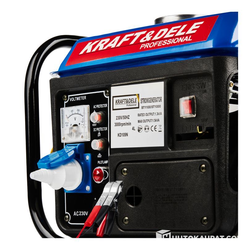 The portable single-phase generator branded KRAFT&DELE is designed to produce 220–230 V AC using a Japanese OHV 2‑stroke internal combustion engine with power 1.5 kW (2 hp) and a maximum generator output of 1200 W.
