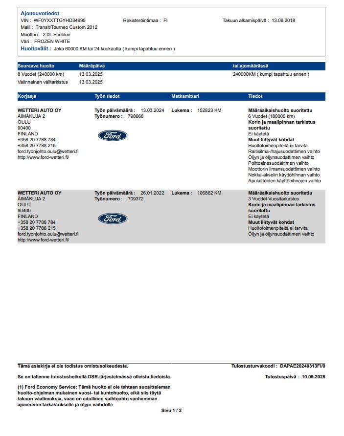 Project for someone experienced. A Transit Custom with moderate mileage and an OK body. Finnish vehicle, no accident history. Inspected at a garage and found wear on the cylinder walls and the engine is ventilating. Starts with a jump-start (battery weak from standing). Runs evenly on all cylinders but does not rev properly. Requires an engine overhaul. The vehicle is currently at the garage and can be viewed during the auction by appointment. (Pirkanmaan Autotaito)
