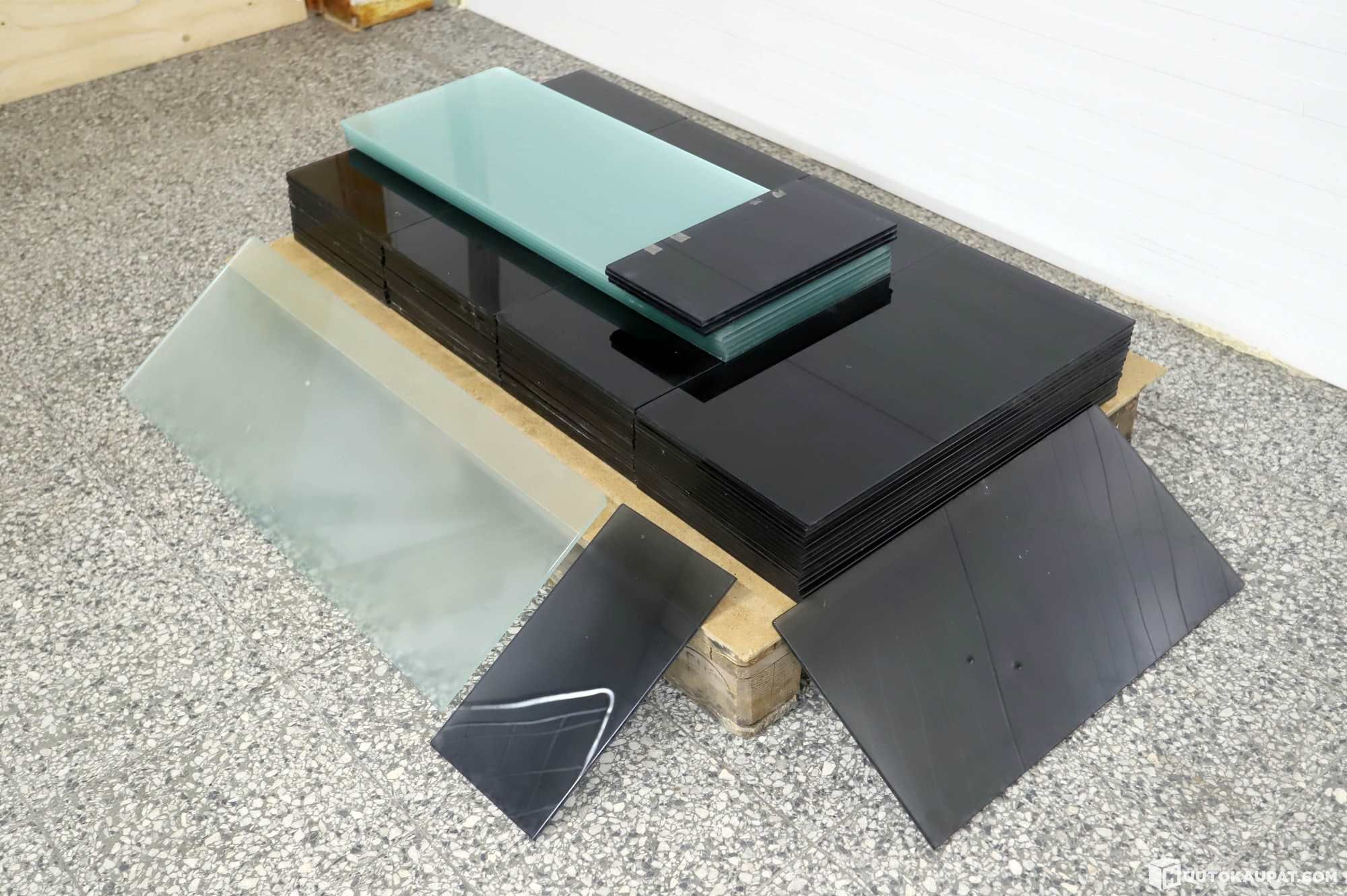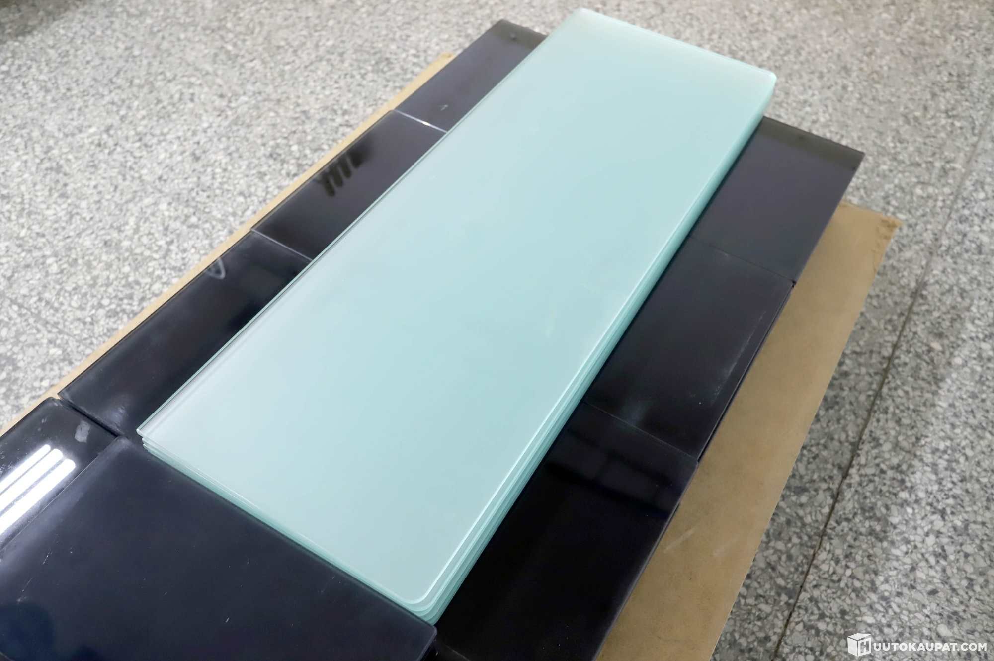 The panes have one smooth side and one frosted side (milk glass). The corners of one long side are rounded.