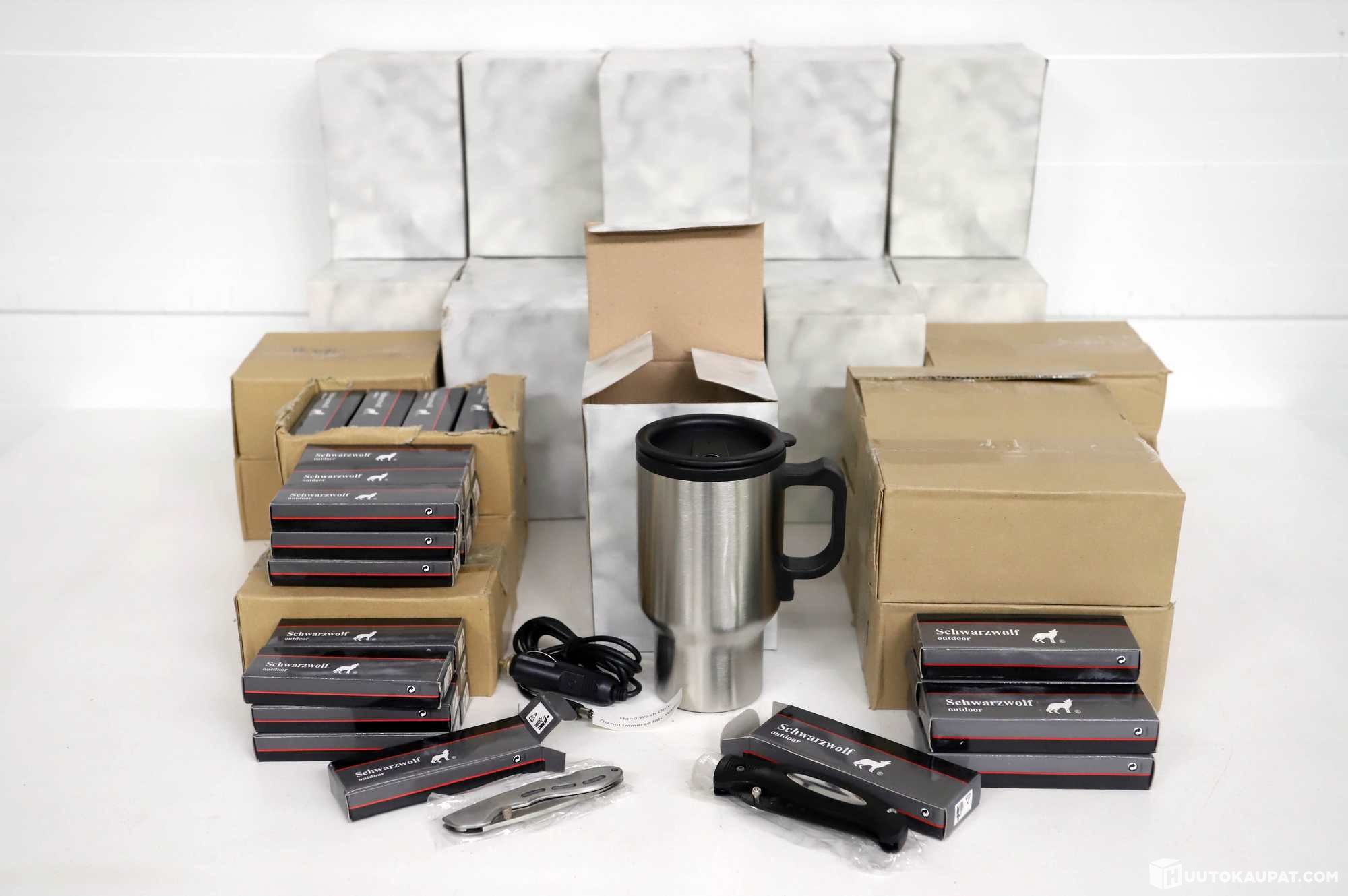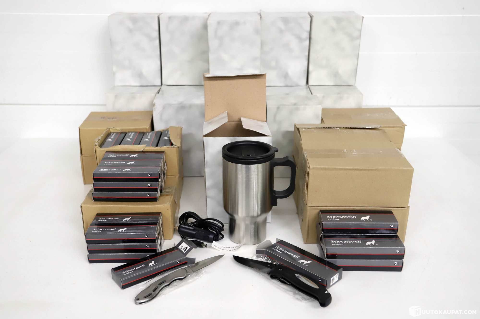 154 Schwarzwolf folding knives and 20 insulated travel mugs.