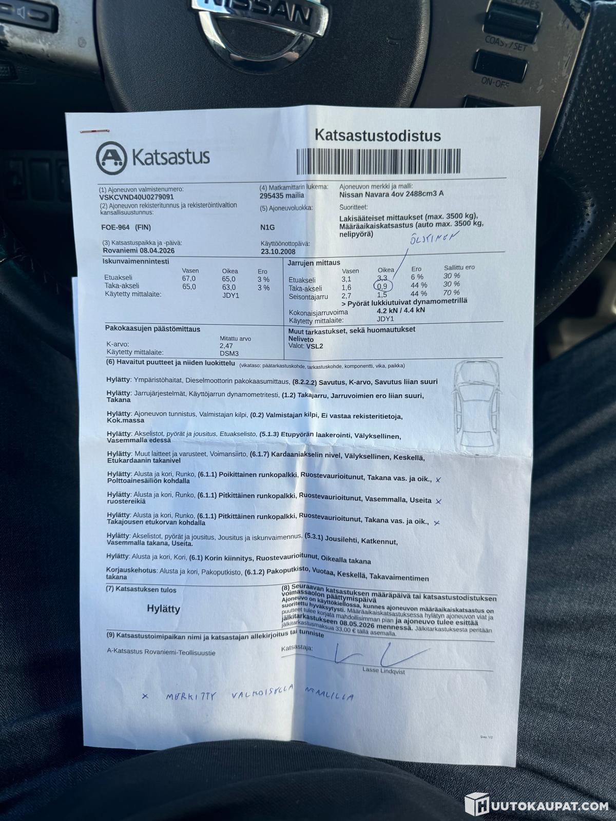 - Failed inspection; see image of the inspection certificate.