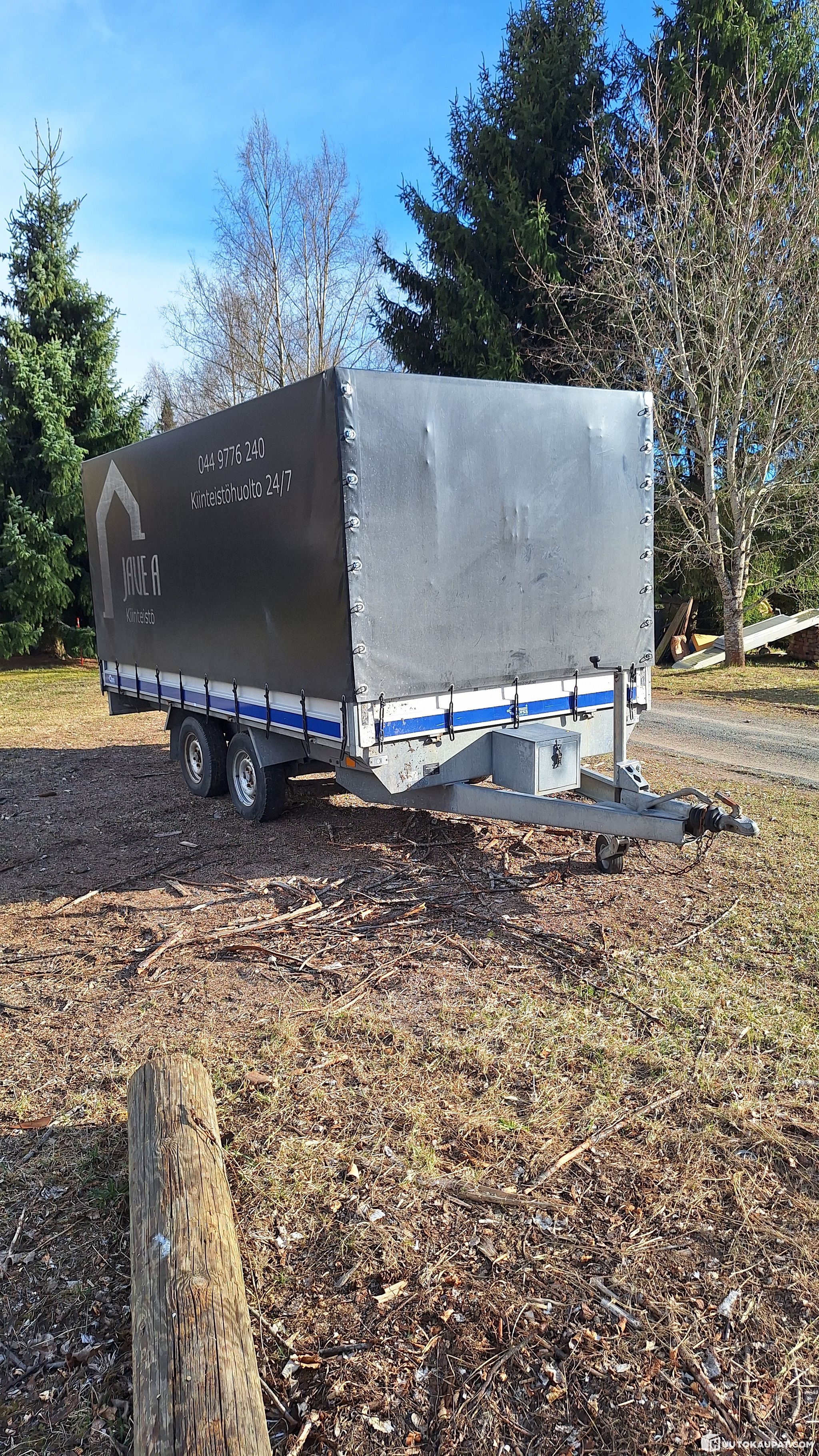 Curtain trailer equipped with studded and summer tyres. Plywood at the front to prevent the tarp sagging when pulled. Cover frame of sturdy steel profile. Separate rope/tool box at the front. Aluminium sides can be opened. Model year – 2010.