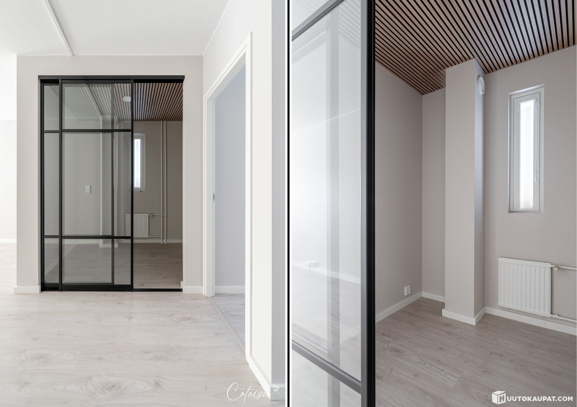The walls are painted in Tikkurila Kashmir, with feature walls in a slightly darker grey. The ceiling is painted white and the study has a beautiful oak acoustic panel on the ceiling.