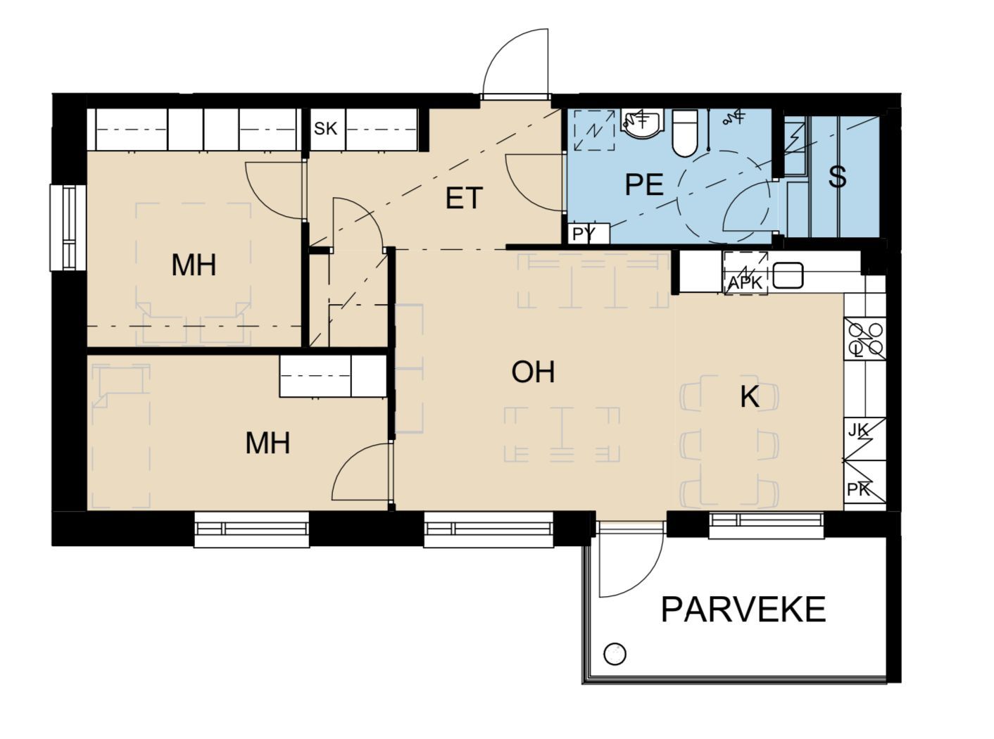 Layout: 3 rooms + kitchen + sauna + balcony