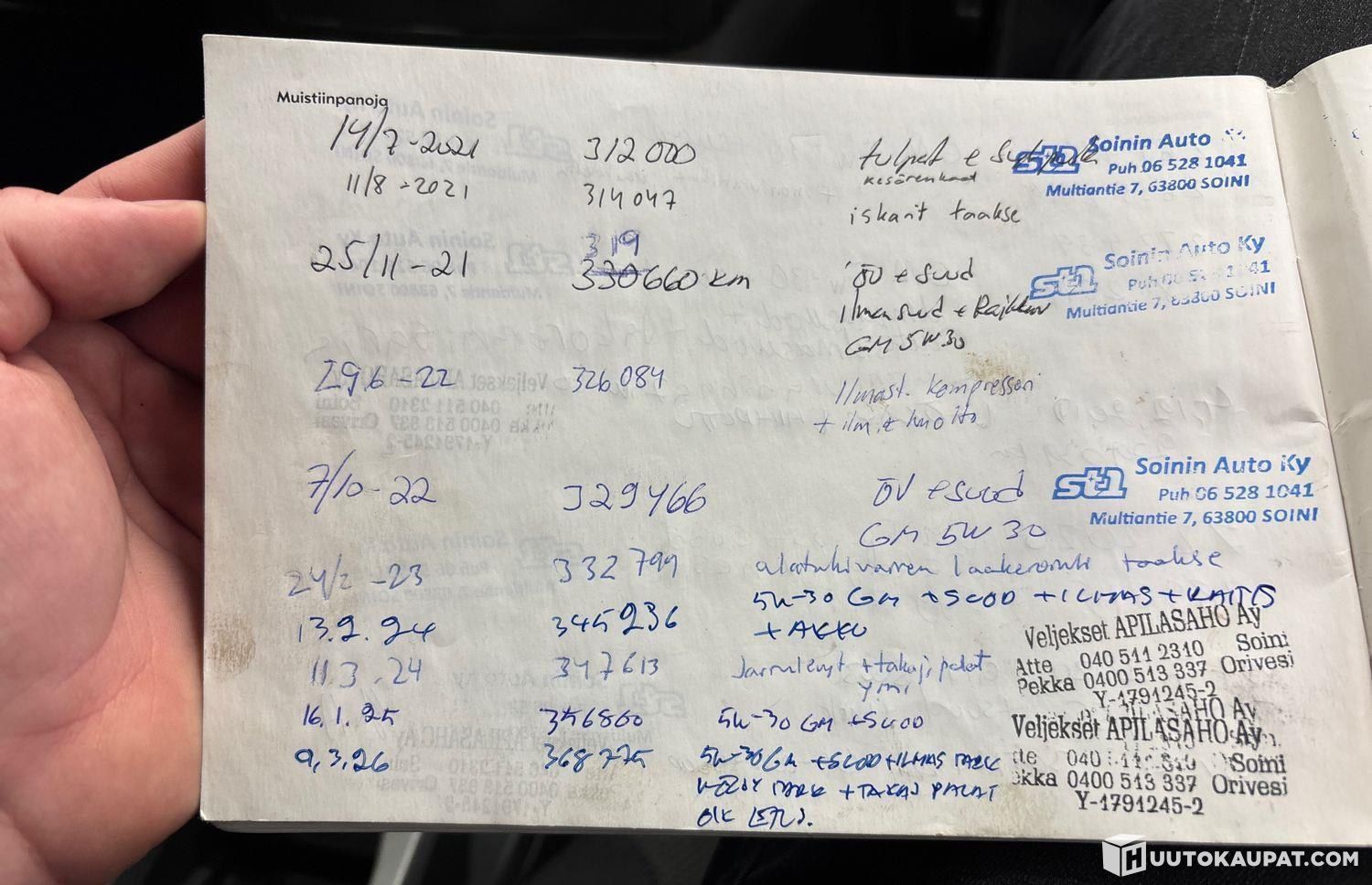 • Service book (Last service 9 March 2026, 368,000 km)