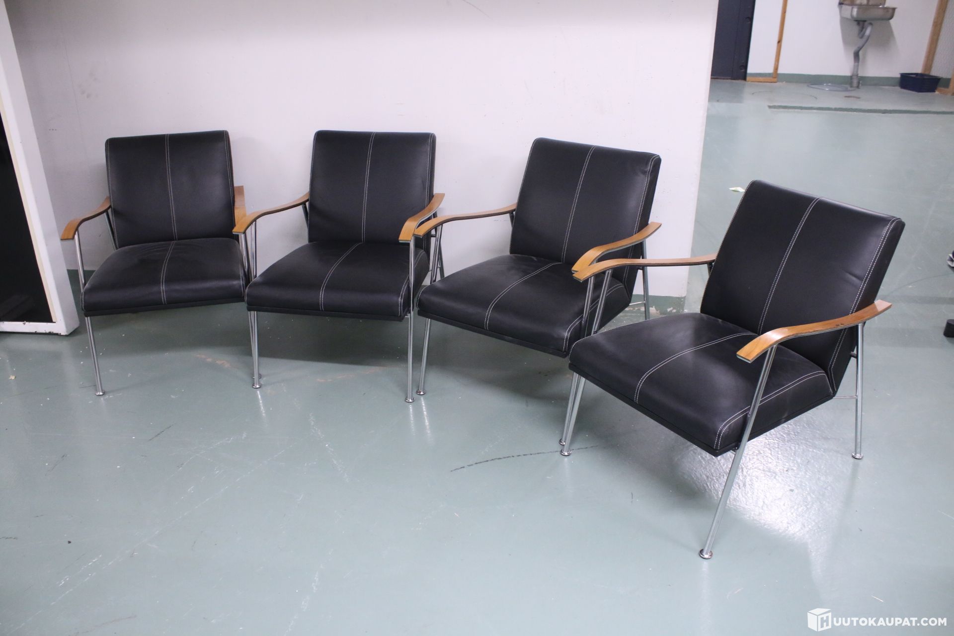 For sale four stylish and timeless Lammhults Sahara design chairs. Black leather upholstery with white stitching, chrome legs and wooden armrests.