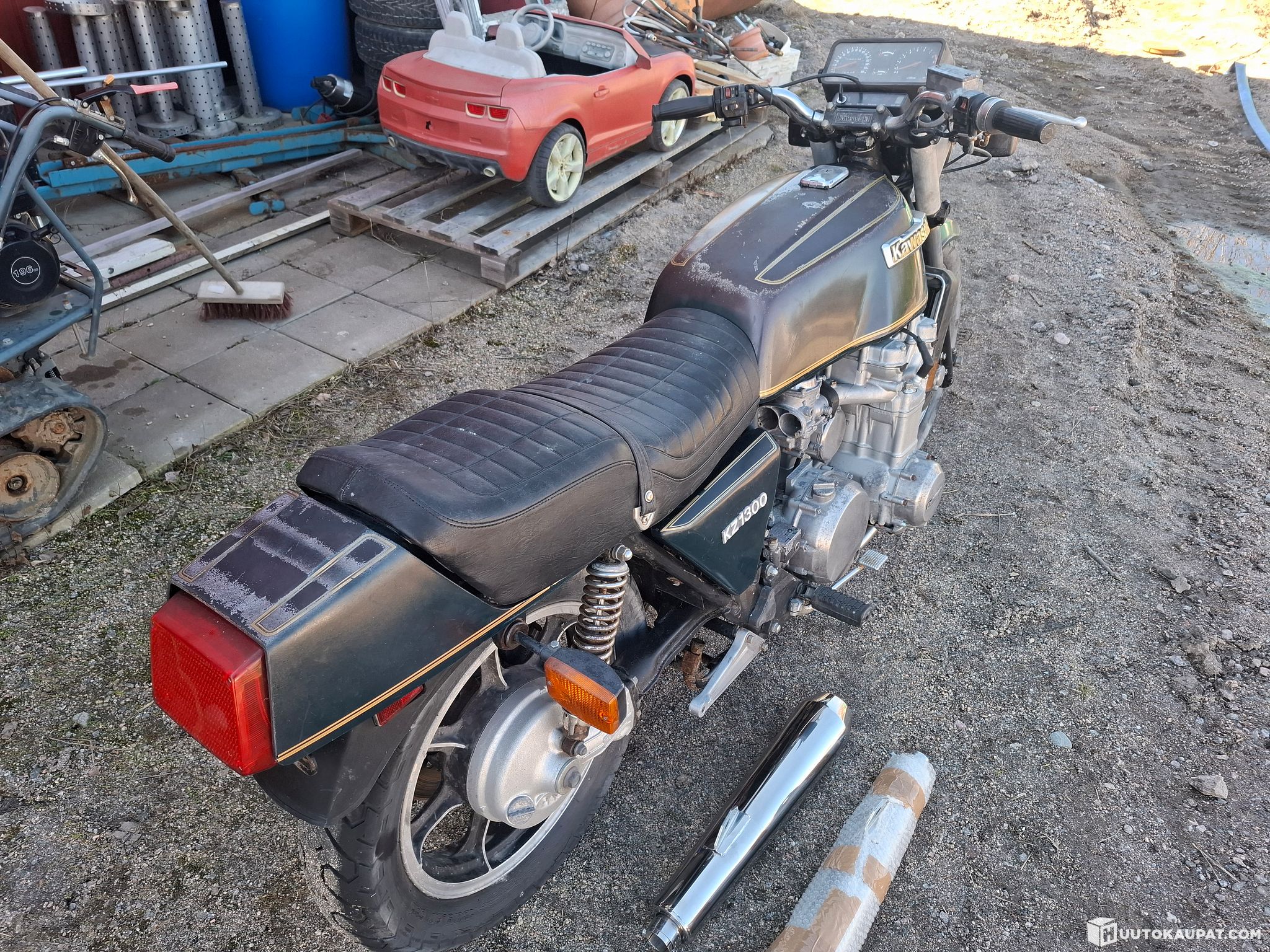 The Kawasaki is offered either to be restored or for spare parts. Has stood in storage for a long time. Requires inspection/servicing.