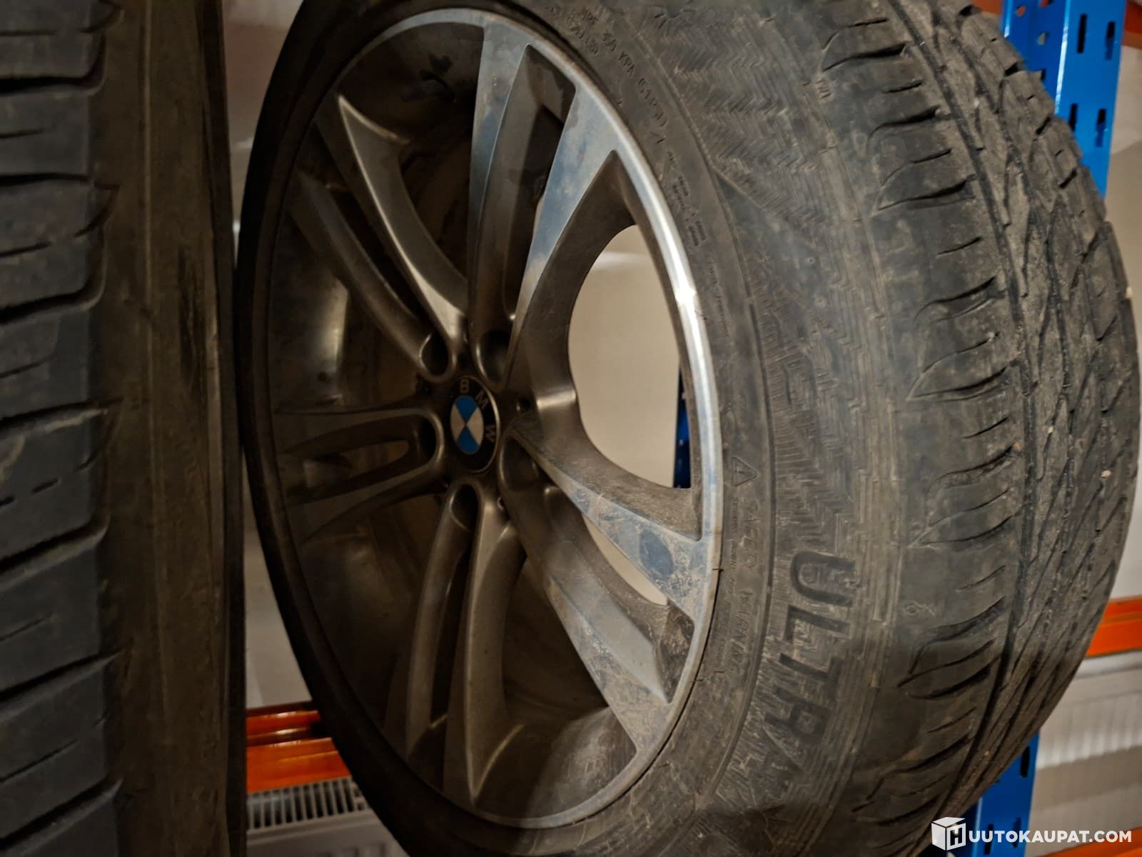 Two sets of tyres with wheels, both OEM BMW wheels. Summer tyres in fair condition (4–5 mm) and winter studded tyres in good condition (7 mm).