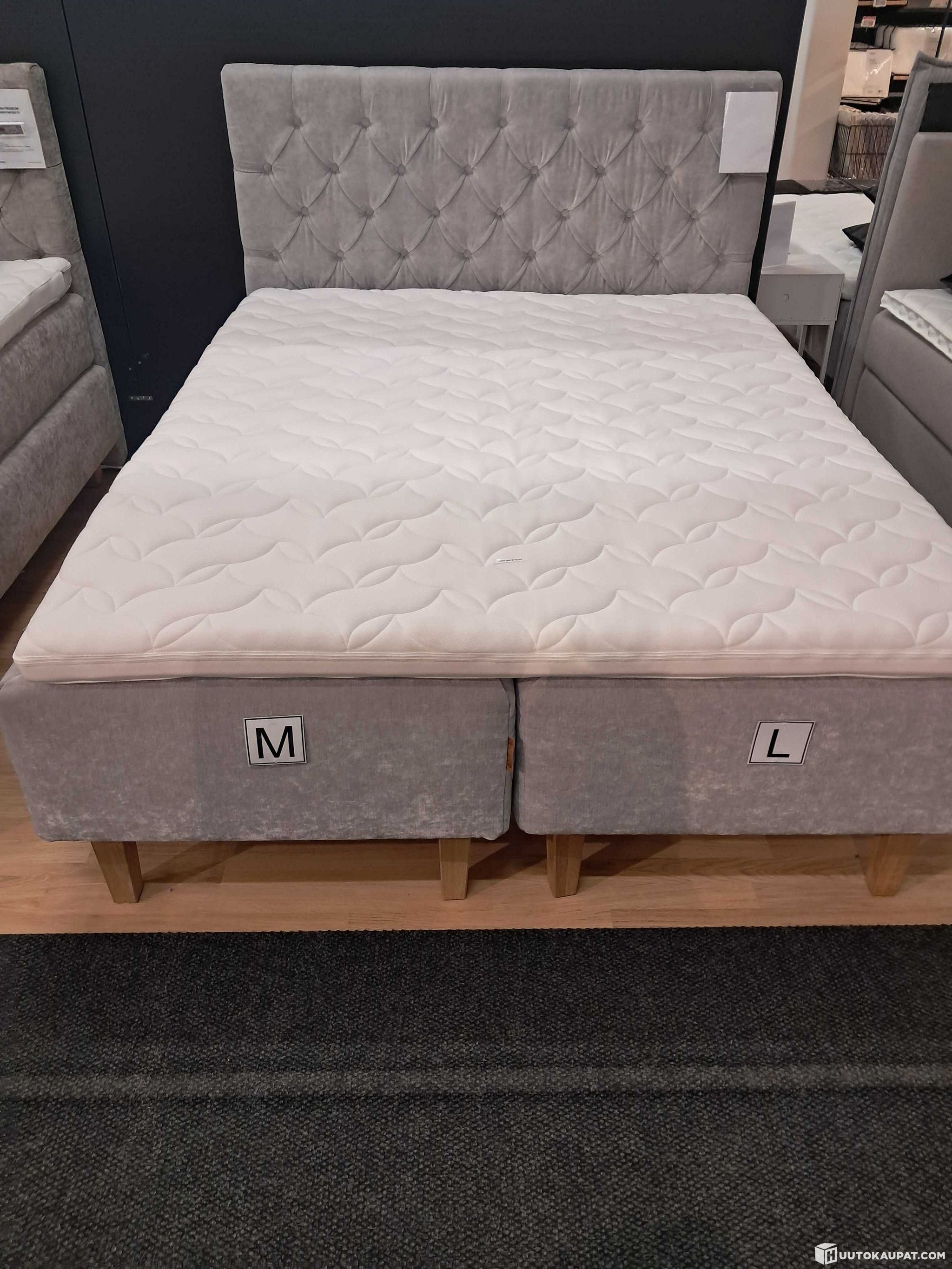 Store sample. Overall in tidy condition; small signs of use and dirt may be present. A new mattress topper cover is included. One base has M firmness and the other has L firmness.
