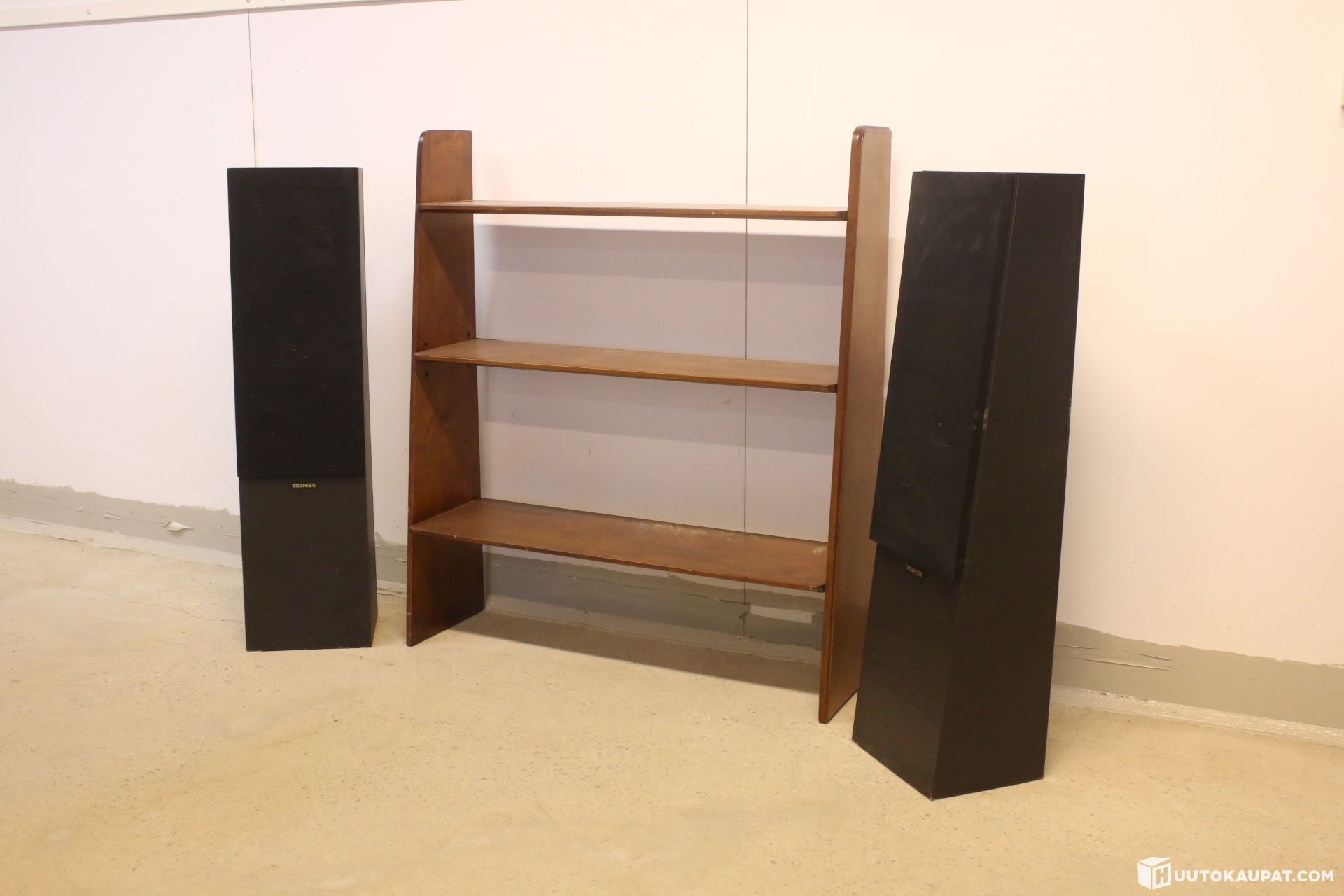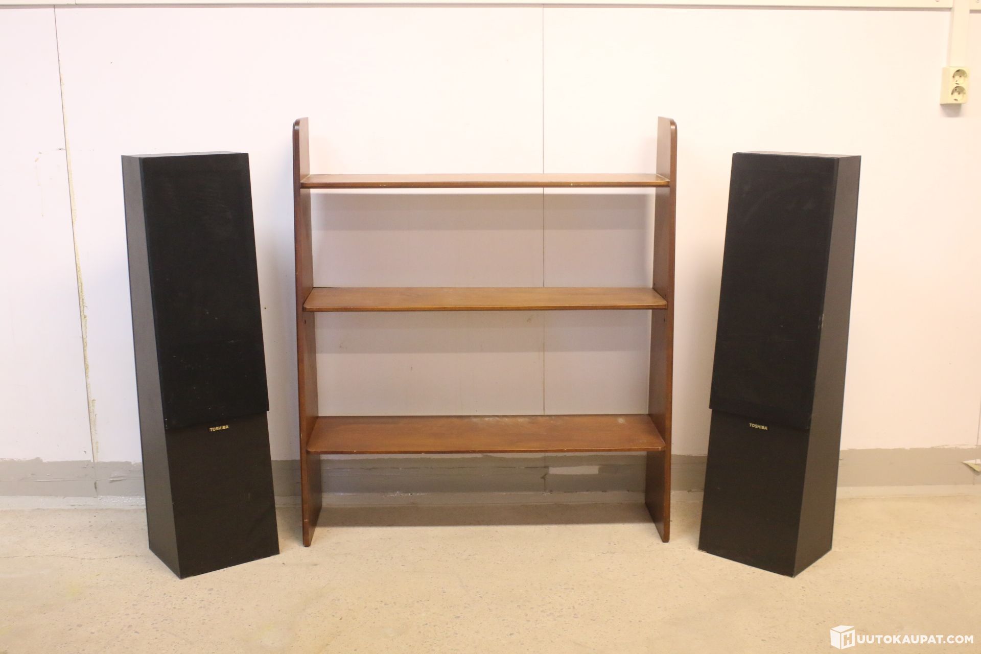 For sale: tidy Toshiba speakers and a matching wood‑coloured shelving unit. Sold for restoration or for parts.